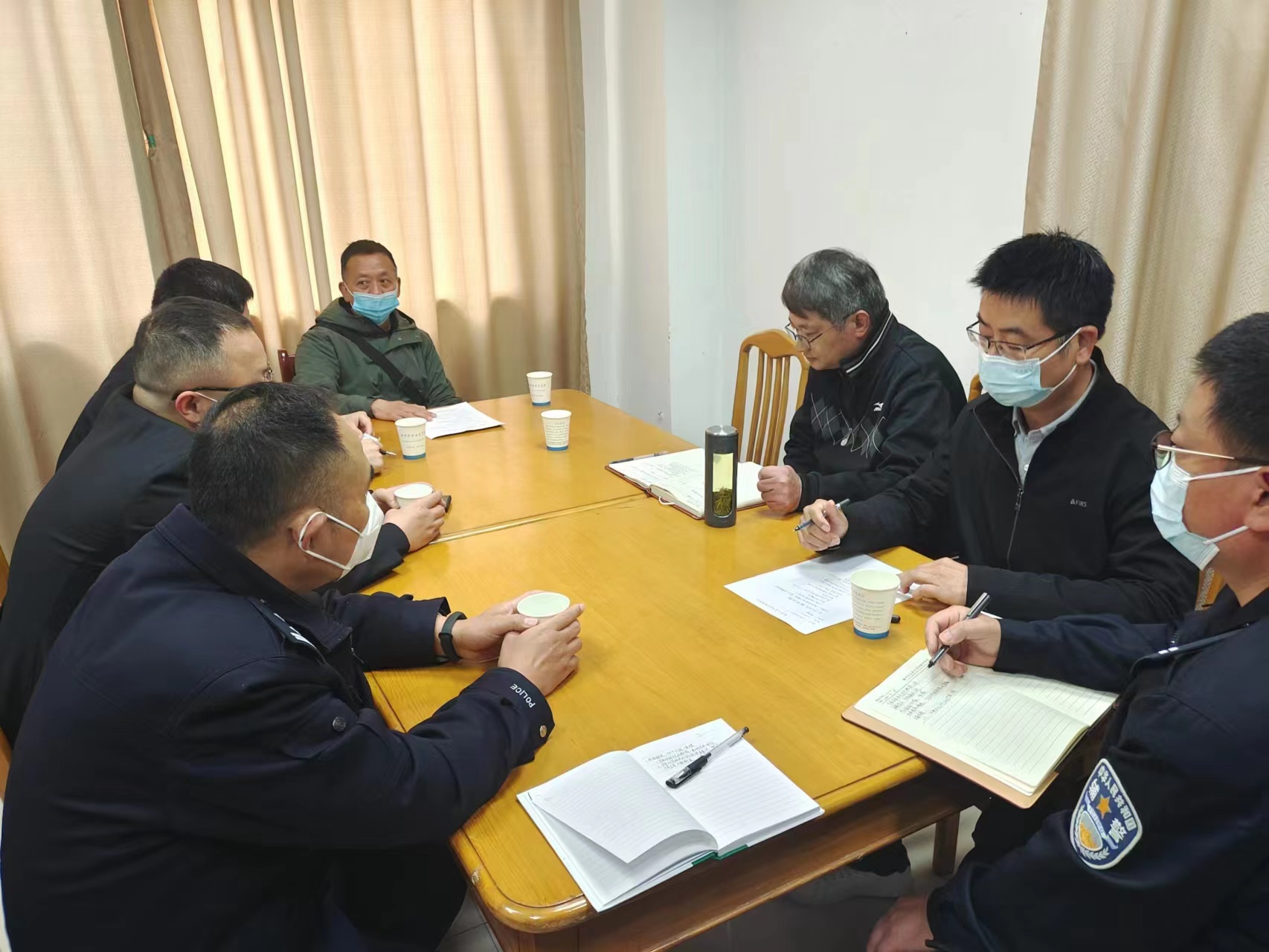 四月二十九日上午八点半,南谯公安局副局长嵇磊携龙蟠派出所所长张庆军和区公安局国保大队王海龙、刘辉一行来万象城官网进行“五一”前安全检查,对接中王海龙大队长通报了万象城官网近期安全稳定情况,提出封闭管理期间要注意学生的心理疏导。安全保卫处贺建邺向公安局同志通报了学校疫情防控和校园安全管理情况。