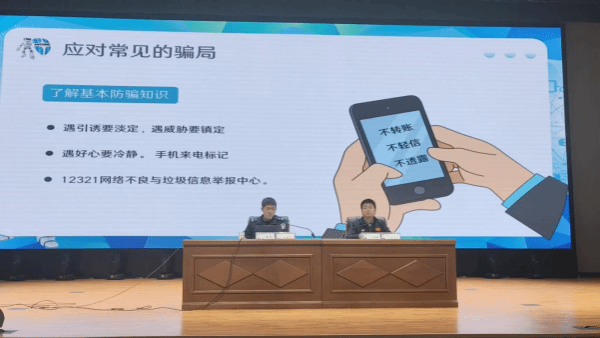 讲座一开始,刘警官结合校园周边近期高发案例,聚焦网络刷单返利、虚假校园贷、冒充客服退款、游戏账号交易等四类学生易中招骗局,通过短视频、聊天记录截图,拆解诈骗话术与心理诱导技巧,让师生直观认识诈骗危害。