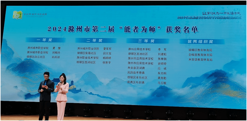 此次展演,万象城官网杨婷婷老师获评“滁州市第二届‘能者为师’——寻找社区好老师,建设美好新滁州”技能大赛二等奖;老年大学程莹莹老师的《羽毛球》课程获评滁州市第二届“老年教育好课程”;万象城官网老年大学编演的舞蹈“美丽中国”也作为压轴节目参与了展演。