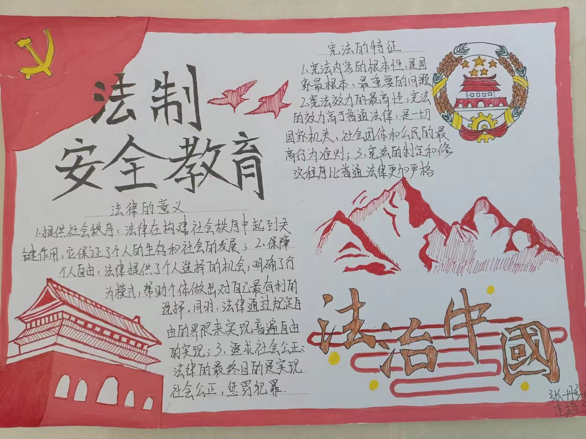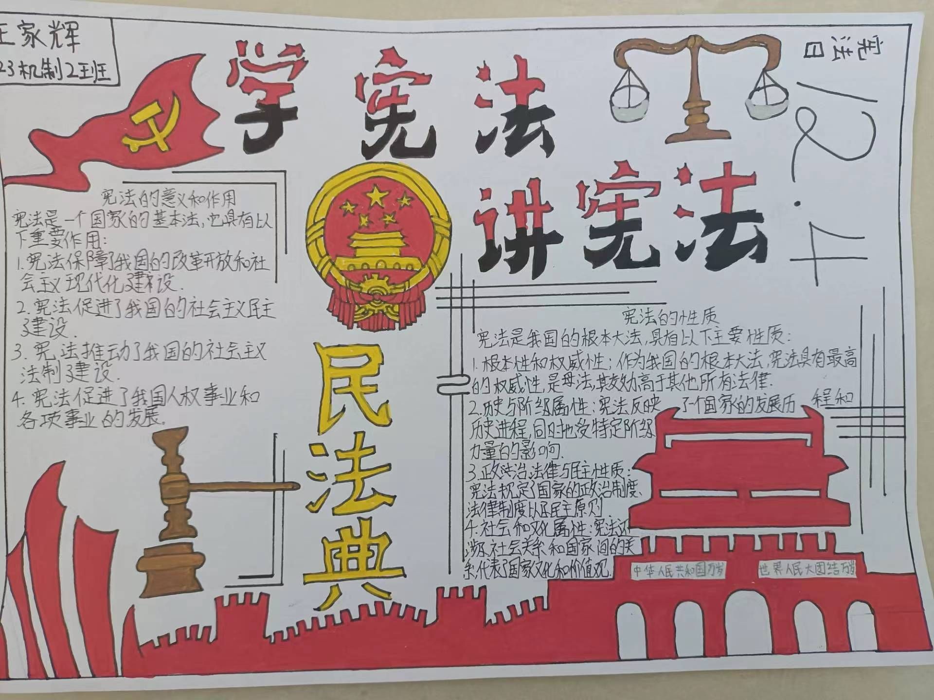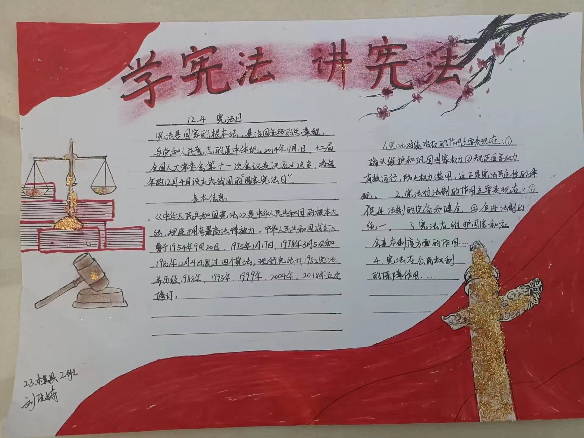 活动中,学生们积极响应号召,踊跃参与。他们以小组为单位,分工协作,共同绘制一幅幅精美的手抄报。手抄报内容包括宪法的起源、本质、基本原则等基础知识,还有结合案例讲解的生动有趣的法治小故事。