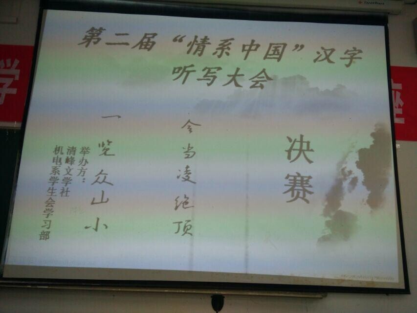 为了倡导书写汉字,保护汉字的意识,2014年11 月5日下午2点在北阶204教室由机电系学习部与清峰文学社共同开展的第二届情系中国汉字听写大会。