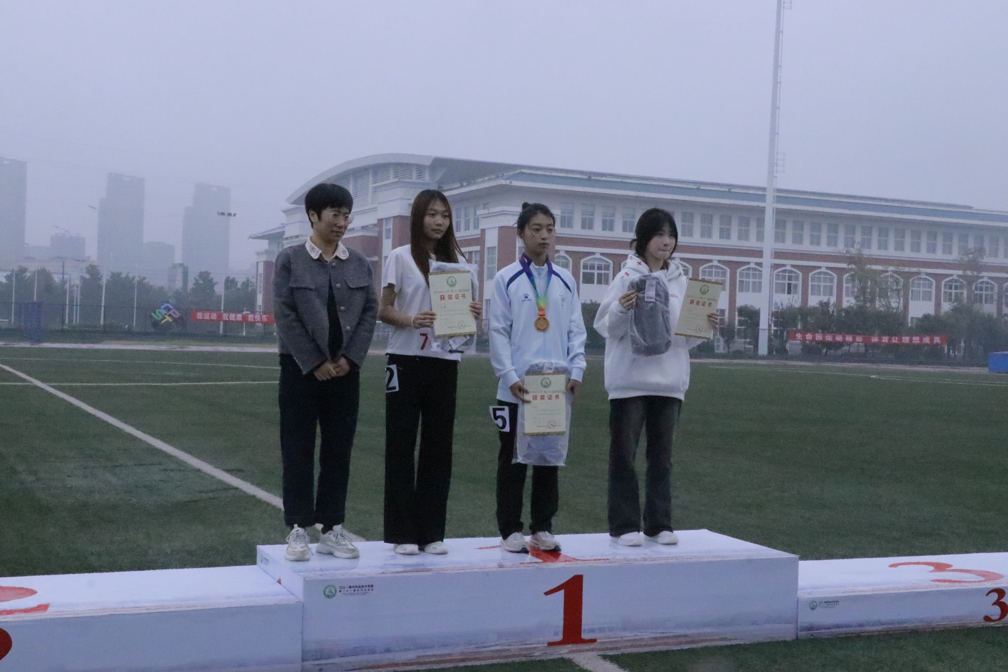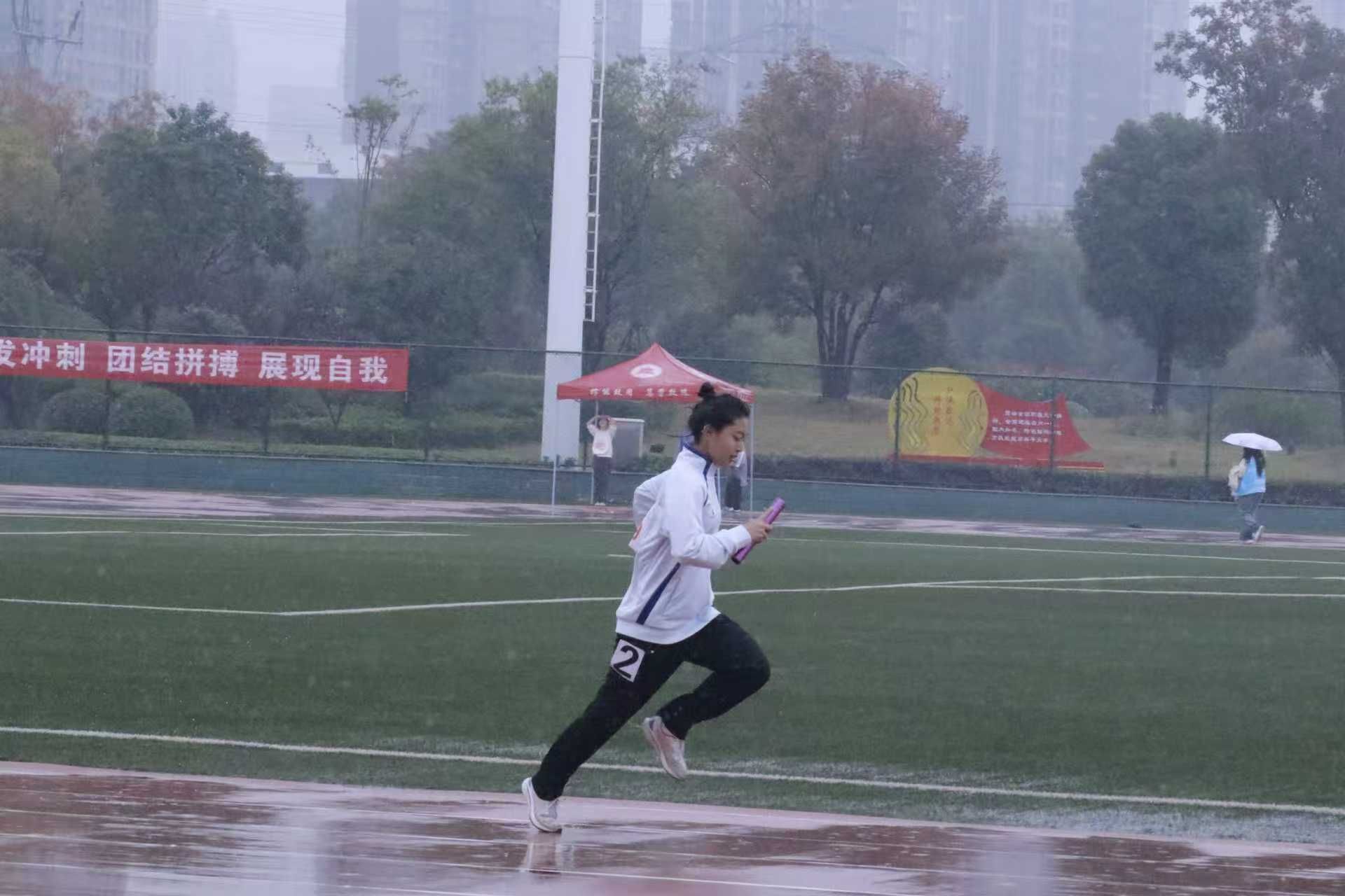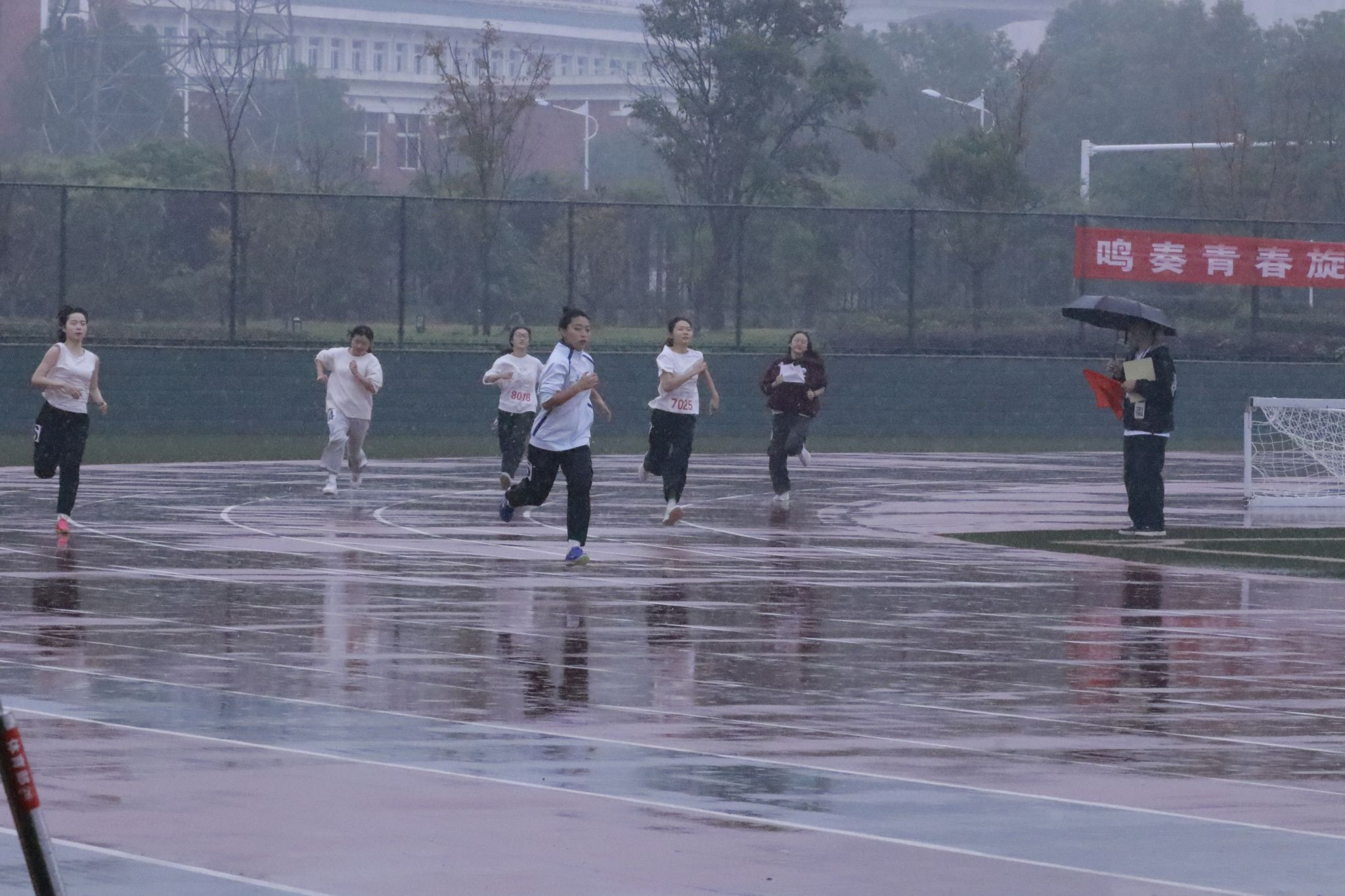在随后进行的女子4×100米接力赛中,雨势未歇,挑战升级。传媒与设计学院代表队的四位姑娘在湿滑的跑道上默契配合、奋勇争先。每一次接力棒的传递,都不仅是速度的交接,更是信任与责任的传递。她们起跑稳健,衔接流畅,即便雨水模糊了视线,依然顶住压力,不断扩大领先优势。最后一棒选手在呐喊声中接过接力棒,全力冲刺,最终不负众望,为学院赢得该项目荣誉。她们用完美的配合展现了“团结一心,其利断金”的竞技精神,成为雨中一道亮丽的风景线。