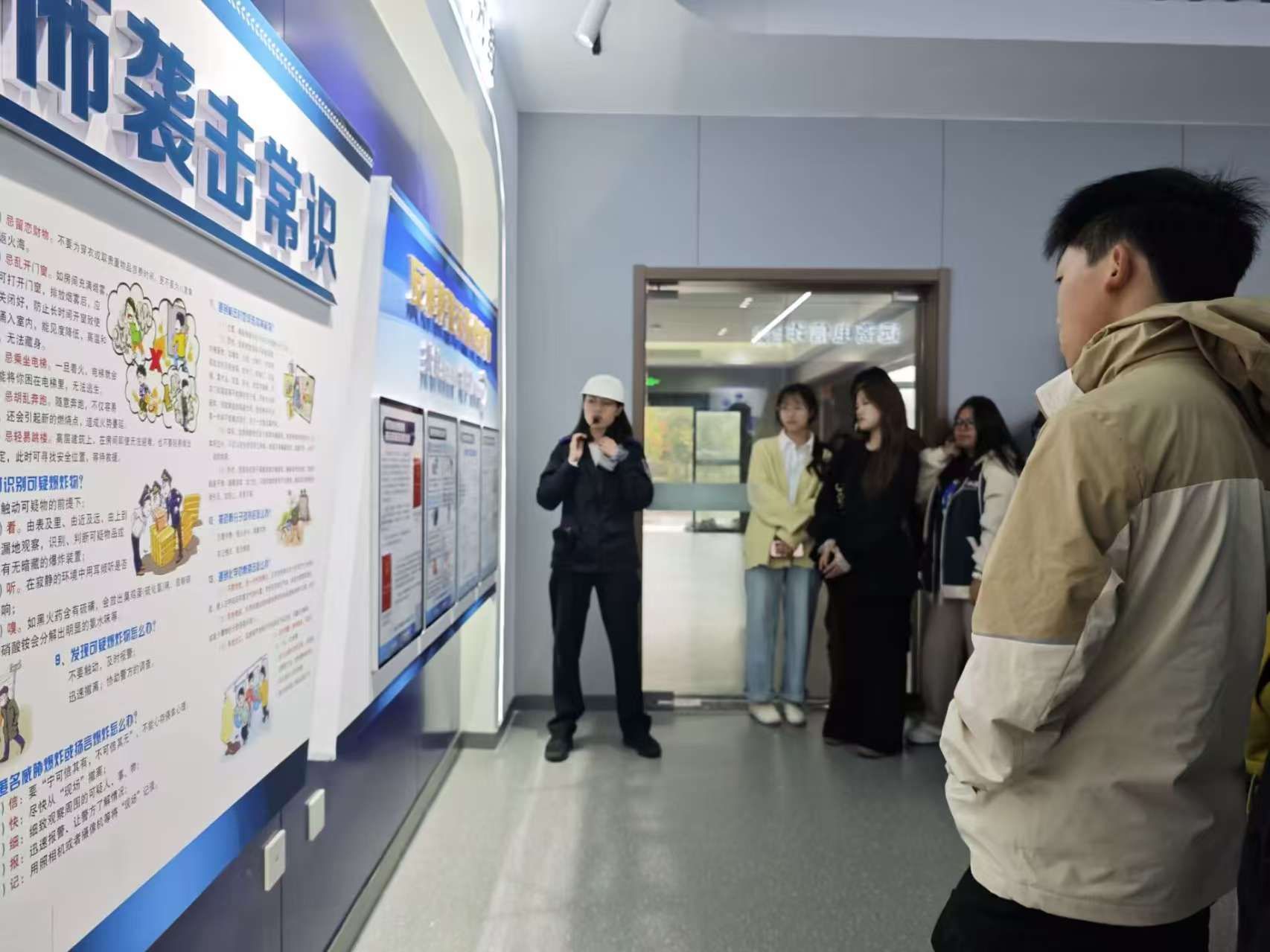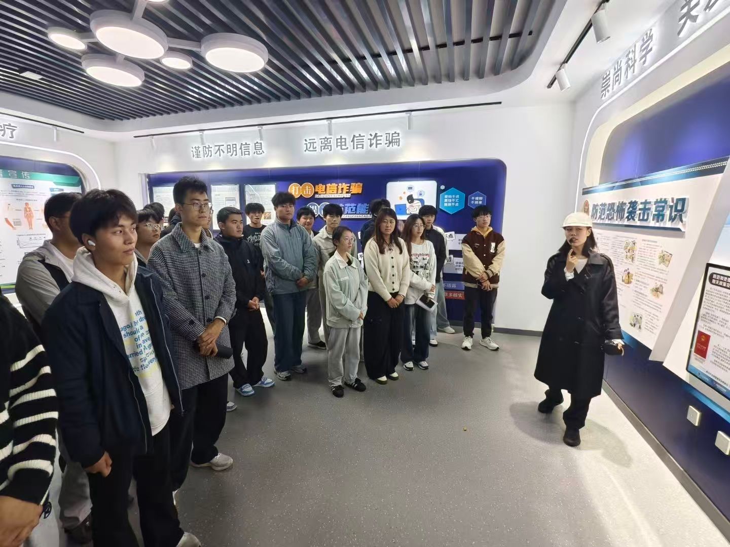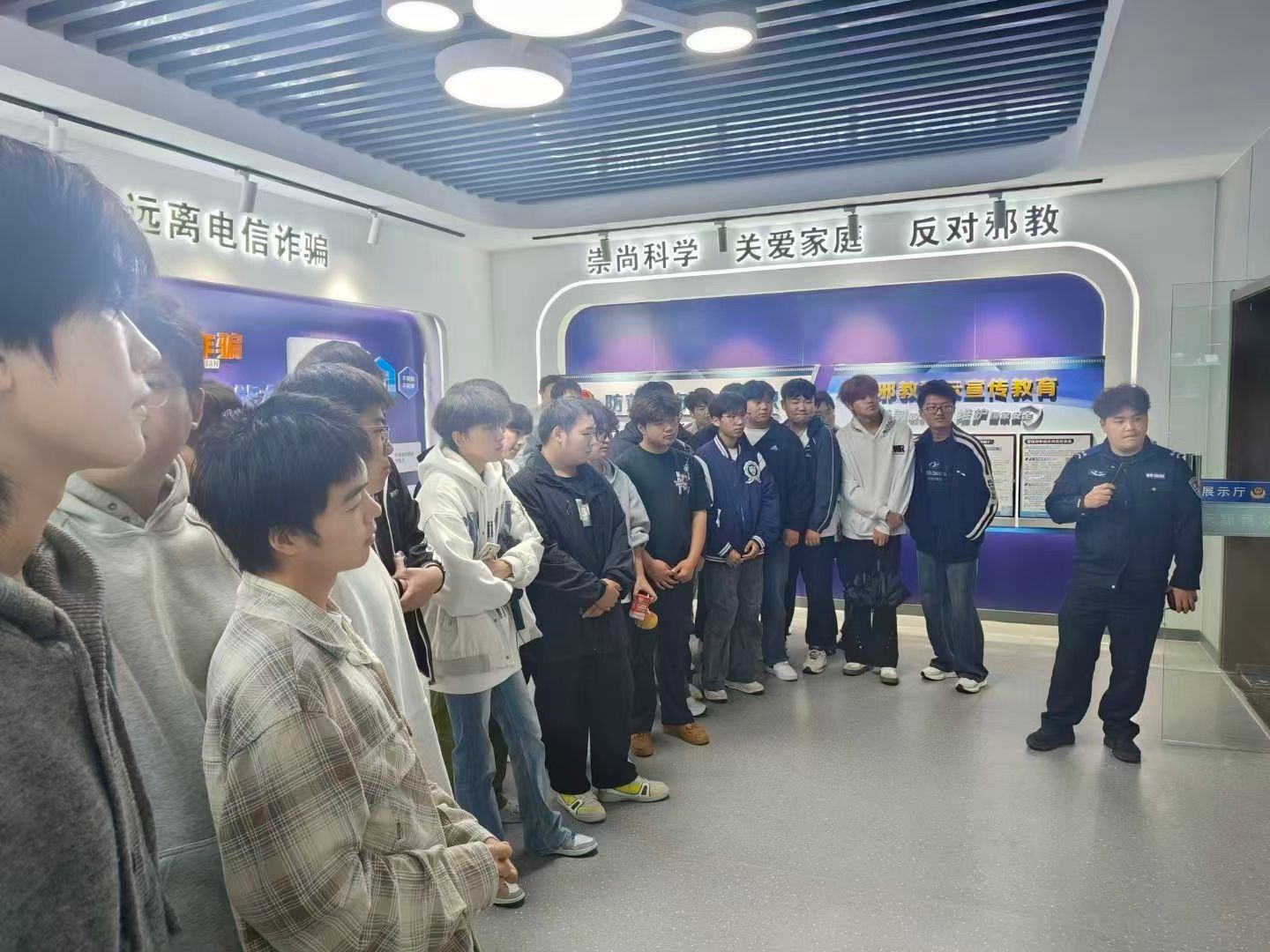 参观期间,警务站工作人员和学校安保人员为新生们进行了详尽的讲解与展示。本次讲解主要围绕禁毒、反邪教、防范恐怖袭击、预防电信诈骗四大板块为背景,由工作人员朱鹤结合大学校园内高发的典型案例,如电信网络诈骗、消防安全、交通安全等,向同学们普及了实用的安全知识和应对技巧,提醒大家要时刻绷紧安全弦,保护好个人生命与财产安全。在参观的过程中,同学们不仅了解了警务站“服务师生、守护平安”的核心职能,还亲眼见到了各类先进的安防设备、警用器械以及高效的接处警流程,极大地提高了同学们的安全防范意识,为人身安全设下一道保障。