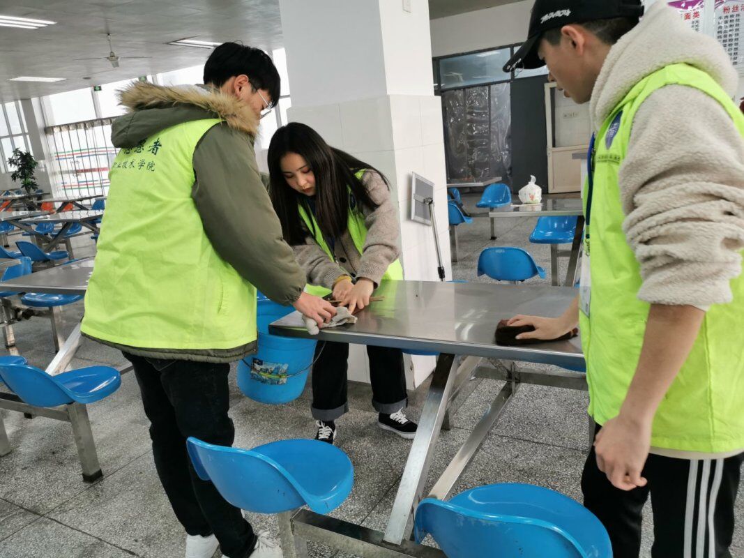 为营造一个文明、洁净、温馨的就餐环境,倡导万象城官网广大师生文明就餐, 12月5日第34个国际志愿者日,万象城官网“小青亭”志愿者开展清扫校园食堂之“走进文明食堂”志愿活动。