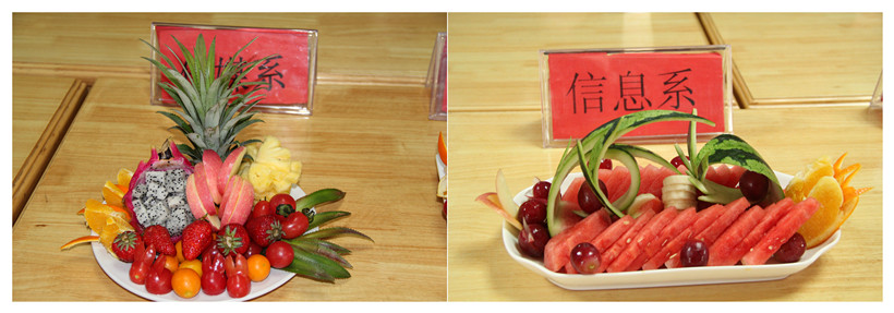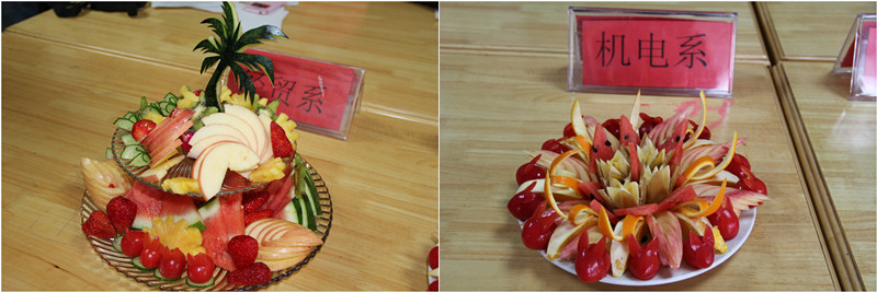 主持人宣读比赛规则后比赛正式开始,工作人员检查了水果及用具,确保比赛的公正和公平。比赛中,参赛选手们全神贯注,互相配合、分工合作,力争展示自己的独特创意,更增添了此项比赛的艺术性。经过激烈较量,经贸系代表队作品“沙滩夏日”荣获比赛一等奖。