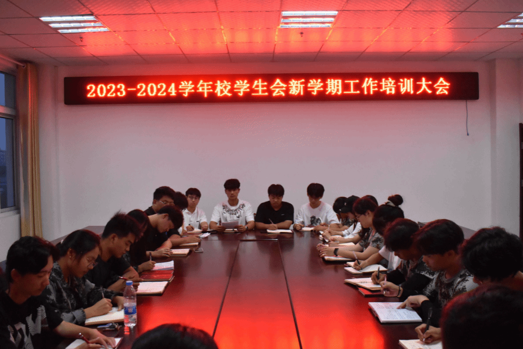 2023年9月4日,校学生会在317会议室召开了新学期第一次工作培训大会。会议由校学生会指导教师陈苗主持,团委教师张姗姗、张忠、王淋以及全体大二干事参加。