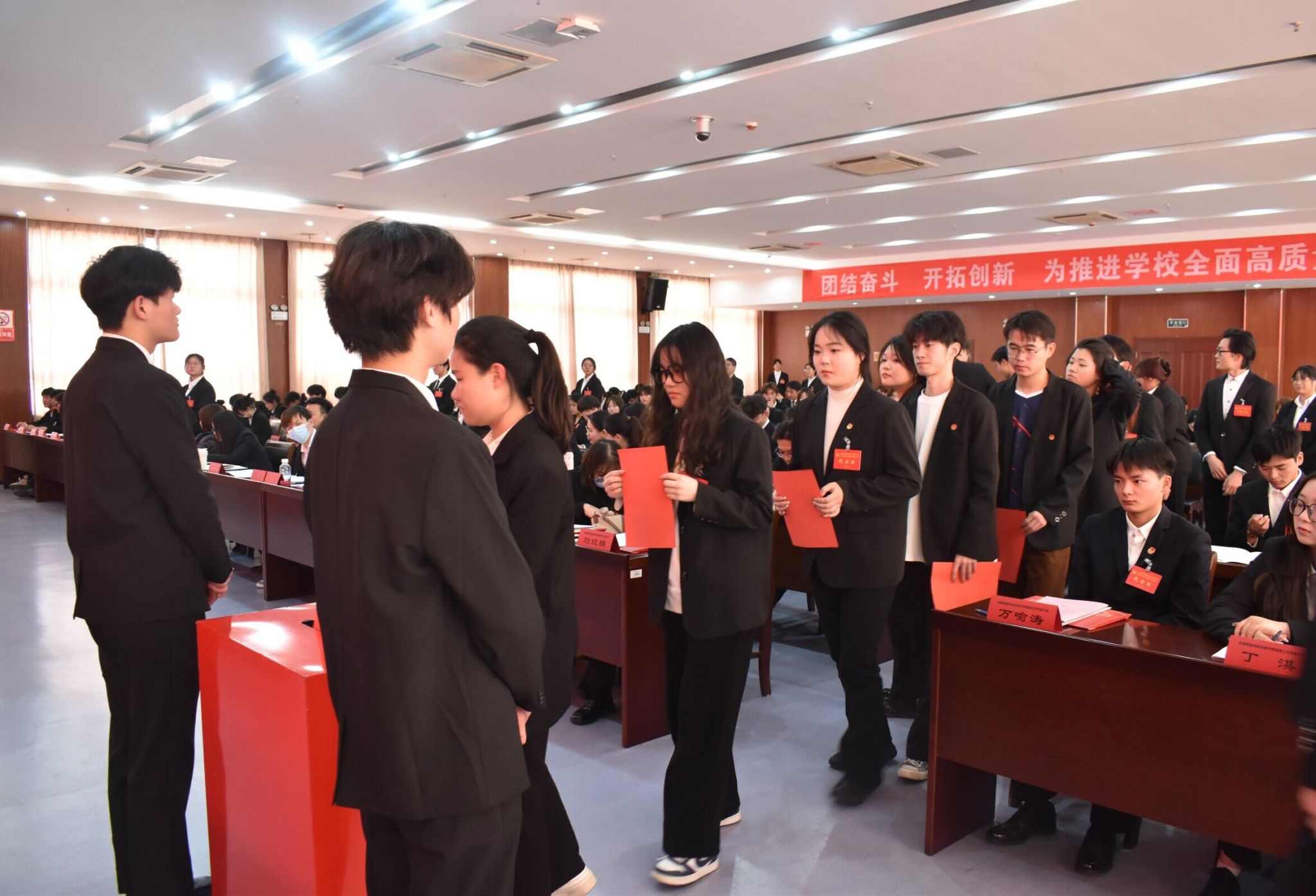 12月6日,共青团allwincity万象城官方网站第三次代表大会、allwincity万象城官方网站第五次学生代表大会(以下简称团学代会)在综合楼五楼报告厅隆重召开。校党委副书记、校长许雪峰,校党委副书记杨家庆,校党委委员、纪委书记孙静,共青团滁州市委副书记戴莺,校党委委员、工会主席李平权,校党委委员、商学院党总支书记李超,校党委委员、组织人事处处长王宇,滁州城市职业学院团委书记陈婷婷出席会议,教务处、学生工作处负责同志、相关学院党总支书记,团总支书记以及100名团代表、125名学代表参加会议。大会由校团委书记甄帅主持。