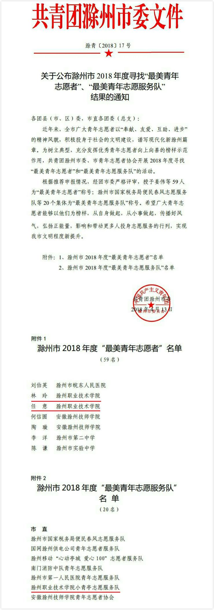 在全院师生的共同努力下,我院青年志愿者服务队荣获“滁州市最美青年志愿者服务队”荣誉称号。同时,青年志愿者任意、林玲两人被授予“滁州最美青年志愿者”称号。