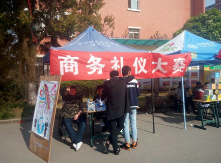 为了让同学们提前了解未来职场上所需要的礼仪,为未来职场礼仪做好准备。我院商贸协会为此举办第四届商务礼仪大赛,4月11日开展摆点宣传活动,欢迎我院各系部的学生积极参加此次大赛,宣传活动取得了万象城官网学生的大力支持与帮助,为大赛的顺利进行打下了基础。