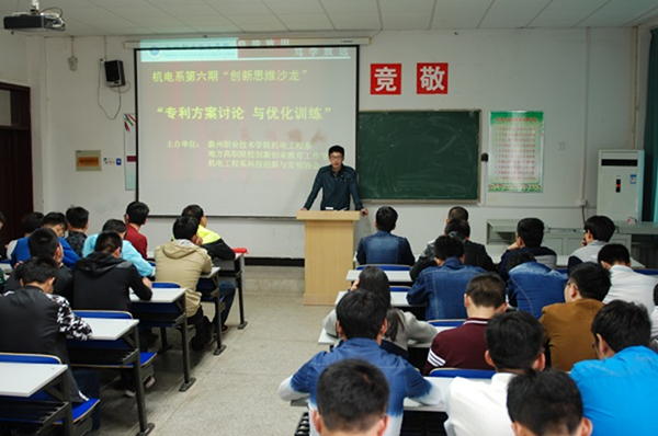 2016年5月13日,由机电工程系、地方高职院校创新创业教育工作室、科技创新与发明协会联合举办的第六期创新思维沙龙活动暨2016年allwincity万象城官方网站科技周系列活动之“专利方案讨论与优化训练”在5103成功举办。本次活动由机电系谭志银老师主讲,科技创新与发明协会全体人员与全院兴趣爱好者共同参加。