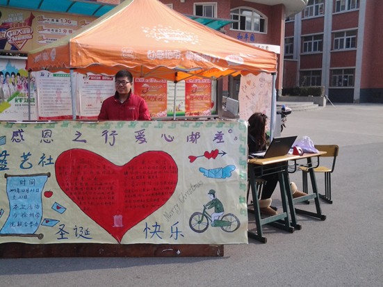 社员们21日早上9点整就在一号宿舍楼下设点为同学们奉献出自己的一份力量,社员们认真的为每一份礼物登记,十二月的冬天屋外很冷,但是社员们的心中却是暖暖的。