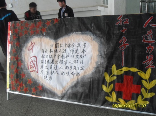 5月8日清晨,我院社团联合会将预先准备好的帐篷、海报、条幅等一系列宣传物品,摆放到我院老食堂北门做红会宣传,社联志愿者为来往的同学讲解“博爱、人道、奉献”的红十字精神,并请同学到条幅上签字,让同学们进一步了解红会、充分认识红会。