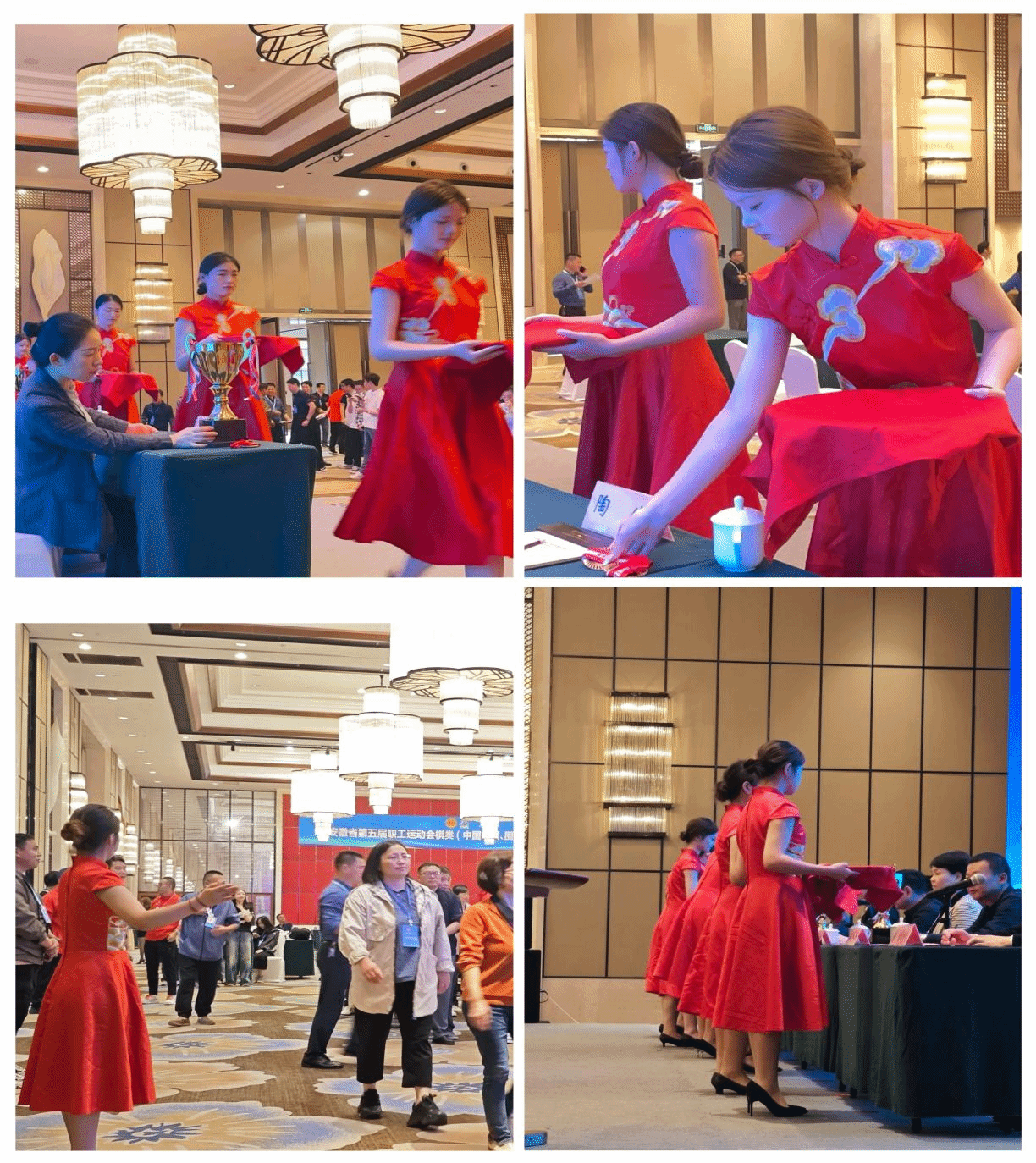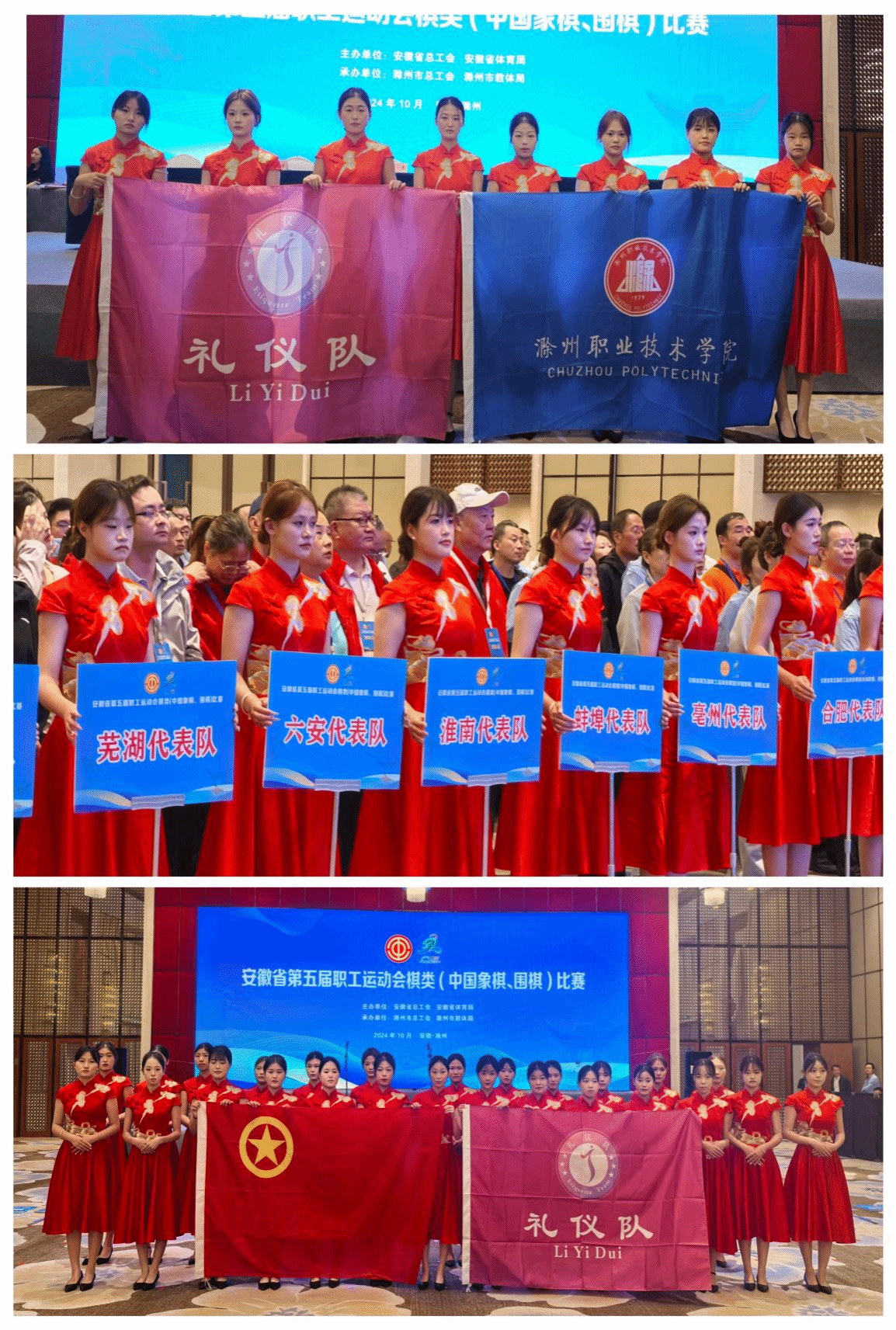 2024年10月16日-18日,安徽省第五届职工运动会棋类比赛在滁州市凯蒂温德姆至尊豪庭大酒店隆重召开。我院礼仪队担任本次大会引领、接待和颁奖礼仪服务任务,12名队员以优雅的仪态、甜美的微笑、端庄的举止、热情的服务,赢得在场领导及与会人员的一致好评,成为会场中一道靓丽的风景线。