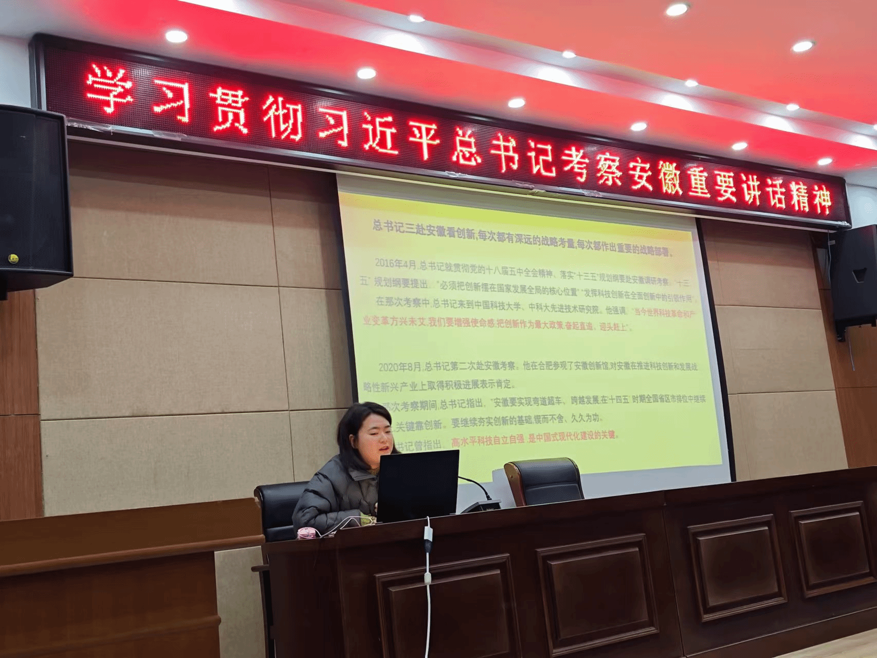 讲座伊始,张娟娟老师深入阐释了习近平总书记讲话的深刻内涵与重要意义,强调总书记对安徽发展提出的新要求与新期望,为安徽在科技创新、生态保护、乡村振兴等多方面的工作指明了方向。