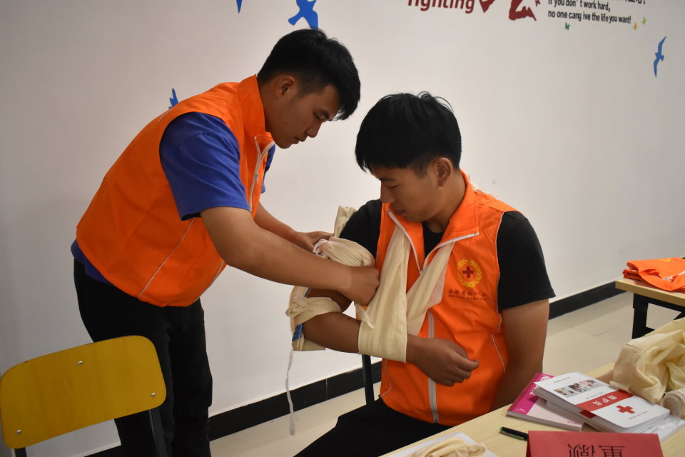 第二天,李朋老师首先为红十字志愿者们讲解了各种情况下的创伤包扎和搬运伤员的实际操作,紧接着志愿者们两两结合,互为救助者和伤员进行练习。志愿者们分组模拟了在生活中可能会遇到种种危险的应对方法,如:蛇咬伤、溺水、骨折、地震等一系列灾害,并且让志愿者随机分组模拟了脑组织溢出、昏迷无意识、小臂骨折等突发状况,志愿者们按照救助流程对伤员进行救治。