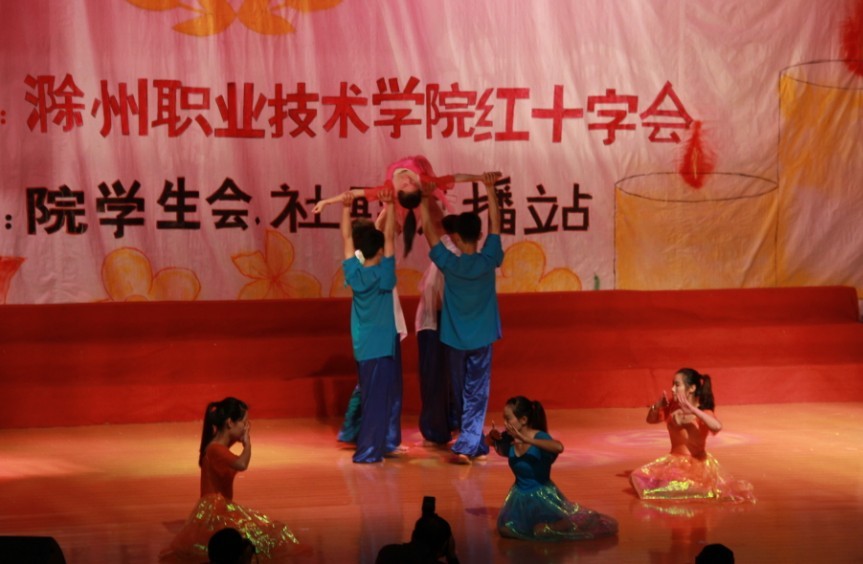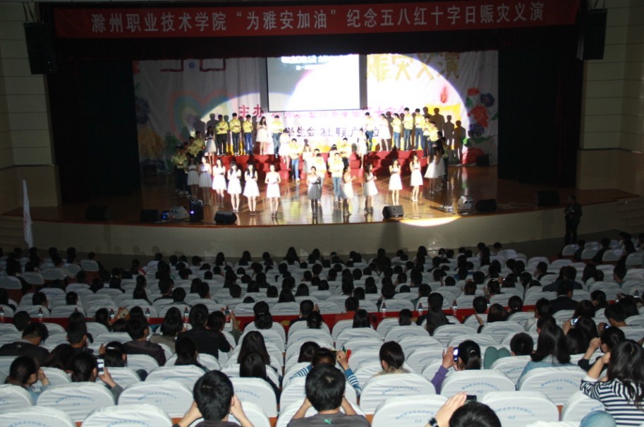 “我和你一样,一样的坚强,一样的全力以赴追逐我的梦想”——由院红十字会主办、院学生会、社团联合会、广播站协办的“为雅安加油”纪念五八世界红十字日赈灾义演晚会于5月8日下午2点和晚上7点在我院大楼报告厅分两场举行。学院党委委员、副院长、院红十字会会长吴大明、南谯团区委书记张伟、南谯团区委副书记戴莺、琅琊团区委副书记施成虎、院学生处副处长温江涛、张军、院思政部副主任李爱红、院团委副书记刘杰、程诚及各系部团总支书记出席此次活动。院红十字会会长吴大明代表学院红十字会致辞。