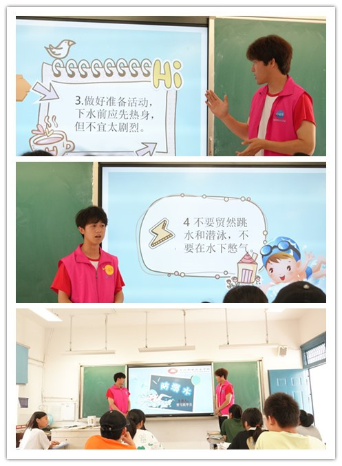 青马学员在指导教师张姗姗的带领下,首先前往仓镇中学进行“防溺水知识宣讲,护航青少年成长”实践活动。学员们通过PPT展示,向在场的同学们讲解了防溺水安全知识、游泳注意事项以及溺水自救方法等;同时鼓励大家从自身做起,带动身边的人学会预防溺水,携手共同筑牢防溺水安全教育的坚固屏障。