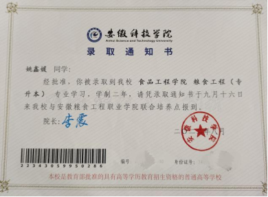 大二期间了解到专升本考试,从那之后,姚鑫媛在心里留下了“考取本科,提升自我”的梦想。她下定决心,不仅要考取本科,以后还要继续考研。就这样,在一年多的努力学习下,专升本以报考专业第四的优异成绩考上了安徽科技学院粮食工程专业(专升本)。同时,顺利转正,成为一名光荣的中国共产党党员。