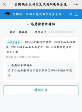 姚鑫媛表示,在备考期间也曾焦虑过,怎么背都记不住知识点,也曾打电话给妈妈痛哭,也曾崩溃到想要放弃,但她为了梦想坚持了下来,她相信通过自己的努力,一定会有收获的。初试成绩公布后,她成功进入复试,最终被安徽科技学院食品工程学院食品加工与安全硕士研究生待录取。