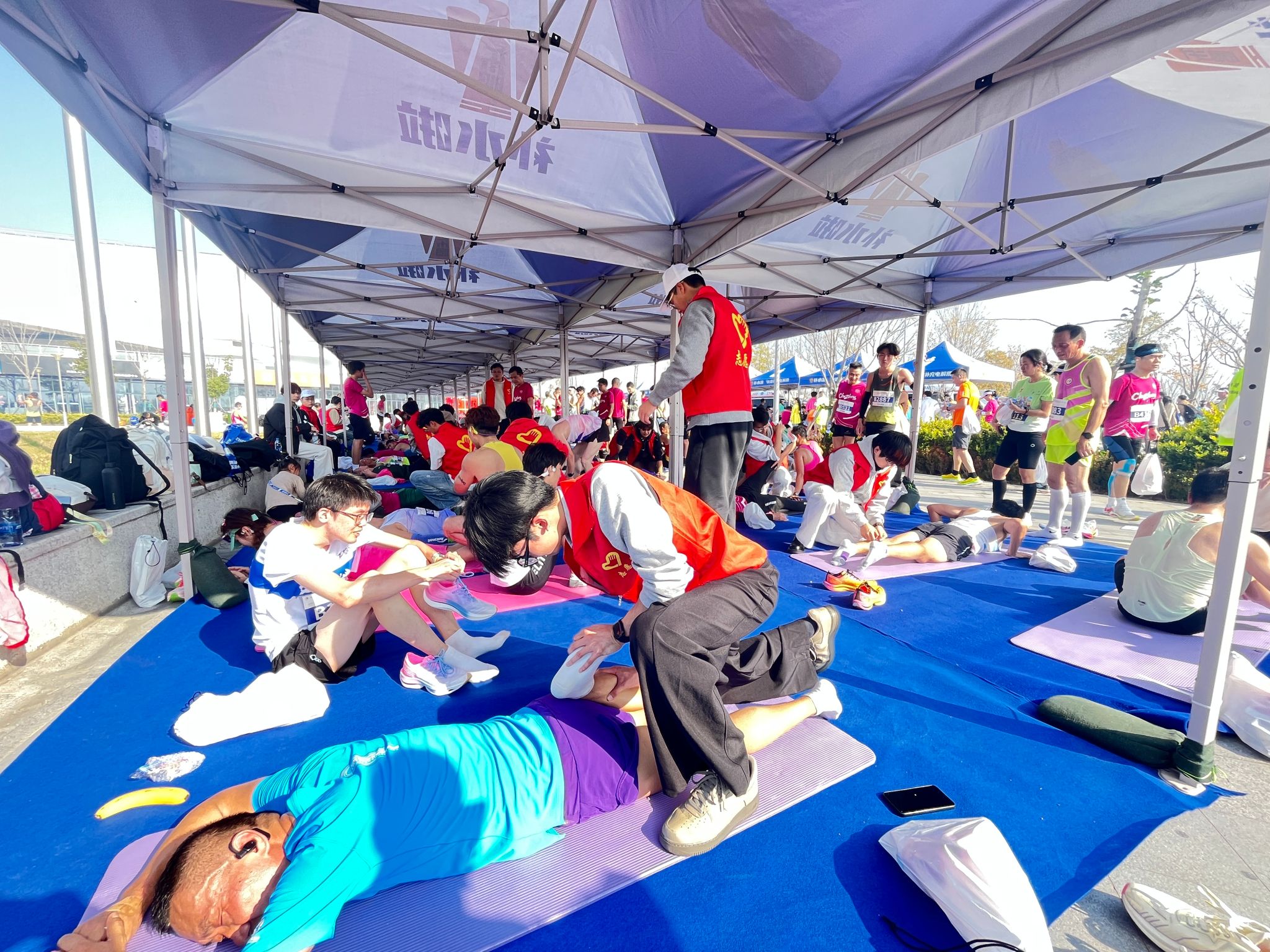 11月16日当天凌晨4:10 志愿者迅速集结并抵达岗位。一部分志愿者组成坚实人墙,分布在赛道沿线,维护现场秩序,保障选手安全,引导观众文明观赛,他们挺拔的身姿成为赛道旁一道可靠的风景线;另一部分志愿者在赛后拉伸区严阵以待,运用赛前专项培训所学的专业拉伸技巧,为完赛选手们提供贴心的拉伸放松服务,帮助选手们缓解肌肉疲劳,尽快恢复状态,让选手们在激烈运动后感受到温暖与关怀。