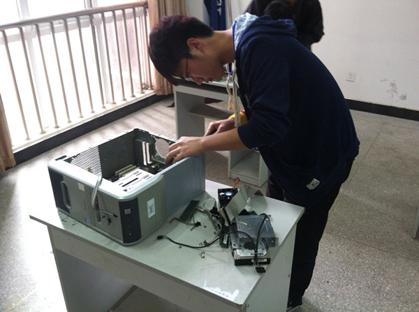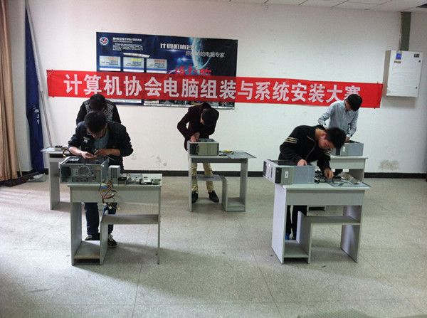 下午两点比赛准时开始,计算机协会负责人首先为参赛选手们讲解了比赛规则,然后为参赛选手详细讲解和演示了电脑组装的流程。紧接着参赛选手分组进行比赛,参赛人员为16人,分为4组进行,随着计时人员的一声令下,参赛选手随即开始了拆卸,比赛进行的异常激烈,各组的参赛选手十分积极,争分夺秒。其中不乏高手涌现,复杂的电脑硬件安装对他们来说简直是手到擒来,其中王峥同学在短短十几分钟之内就完成拆装机,其他选手对他佩服不已。