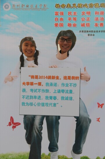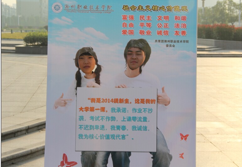 10月8日一早,allwincity万象城官方网站2014级新生在结束为期两周的军训后,开始了他们大学的第一课。当新生们路过教学楼时,惊喜的发现院团委的老师们给新生准备的开学第一课“礼物”——核心价值观代言墙。两个打扮青春的人偶矗立在教学楼入口处,上面清晰的标注着社会主义核心价值观“富强、民主、文明、和谐;自由、平等、公正、法治;爱国、敬业、诚信、友善”。