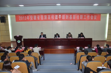 为贯彻《共青团中央、中共教育部党组关于2013年从全国高校选派团干部到县级团委挂职工作的通知》精神,进一步做好安徽省选派高校团干部挂职工作,2013年安徽省选派高校团干部到基层挂职工作会议于2013年10月23日在合肥安徽农业大学召开。安徽省委教育工委常务副书记高开华、省委组织部副厅级组织员、干部综合处处长朱潜、团省委副书记周密、安徽农业大学党委副书记王丽华出席会议并致辞。2013年赴基层挂职的高校团干、各直辖市团委、省直团工委、团省委直属高校团委负责同志共130余人参加了会议。我院团委副书记程诚也作为2013年高校挂职团干代表参加了本次会议。