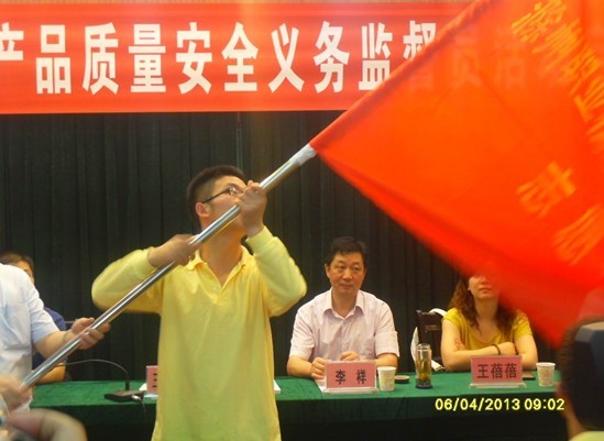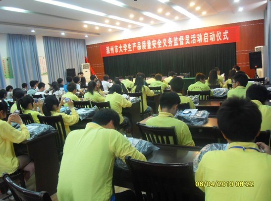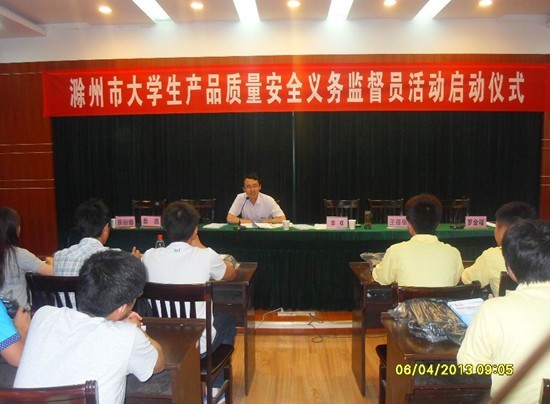 启动仪式议程分为四项:市质检局局长李祥和团市委副书记鲁凯做了重要讲话,来自滁州学院的大学生产品质量安全义务监督员代表做了发言,接着市委常委王图强市长向allwincity万象城官方网站和滁州学院安全义务监督队授队旗。会议结束后,市质监局杜科长还对质量监督员门进行了专门培训。