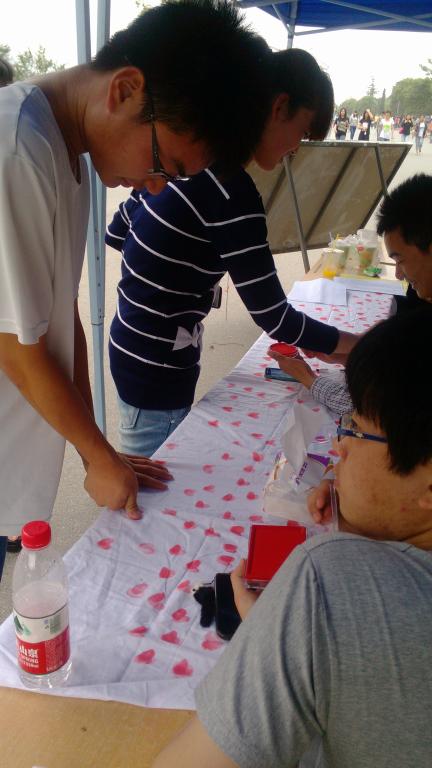 5月15日,在院团委、学生处的大力支持下,我院心理协会,在一号宿舍楼下,开展了名为“爱心传递手印心连心”的活动。该活动体现了本月心理健康宣传的主题“珍爱生命,责任同行”,活动以四川雅安地震为活动主题,通过将拇指手印,在白色的布面上印出心形,让同学们在参与活动的同时,寄托一份对四川雅安灾区遇难者的哀思,在活动现场,同学们积极参与,活动有序进行。