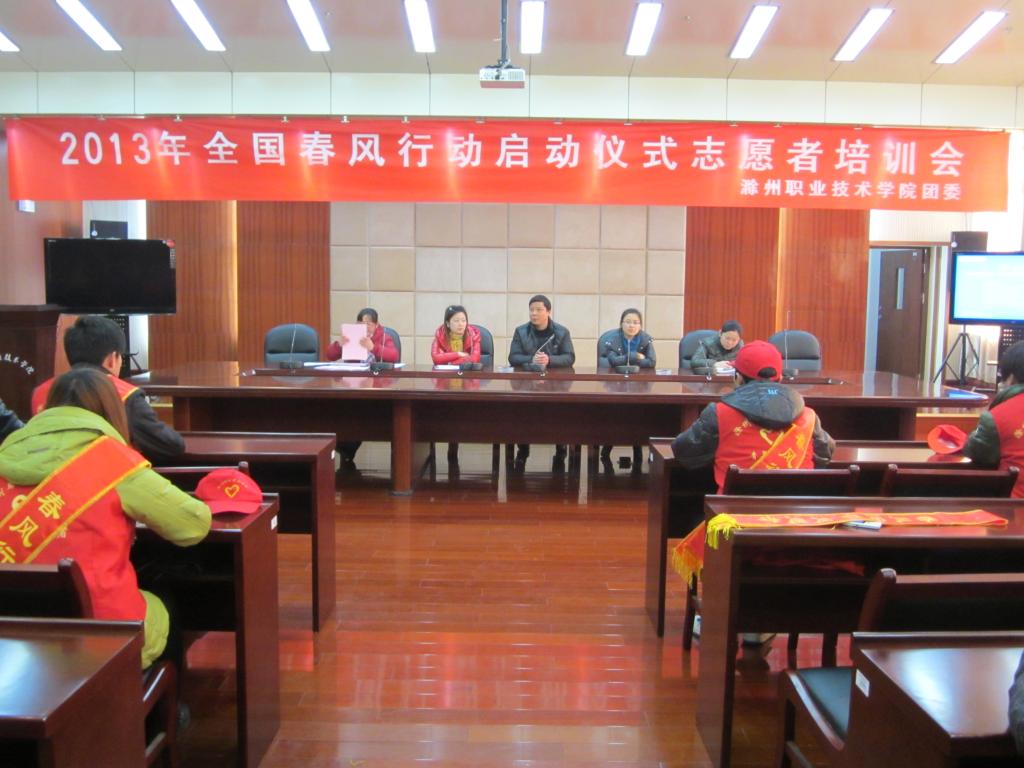 为了做好此次活动的服务工作,2013年1月17日下午,在综合楼11楼学术报告厅召开了“春风行动”志愿者培训会。培训会上院团委程诚副书记、朱婷婷老师对志愿者们的工作做了具体的分工,最后,院团委王蓓蓓书记对志愿者们提出了24个字的要求,要求志愿者们“高度重视,明确任务;遵守纪律,服从分配;注意形象,微笑服务”,
