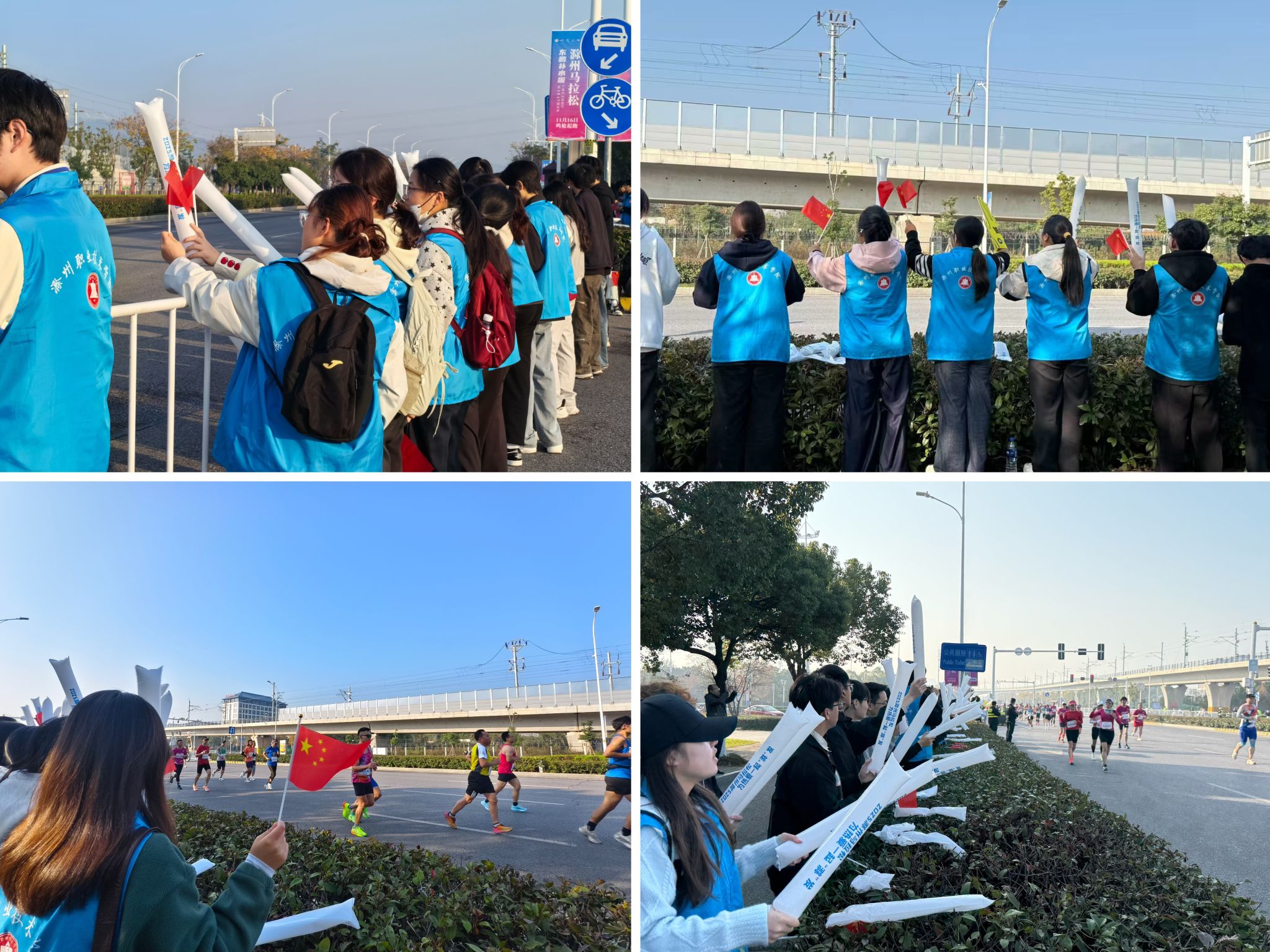 赛道沿线,是信息工程学院志愿者们坚守的“加油站”。他们手持五彩缤纷的助威手摇旗,高举着写满激励话语的标语牌,构成了赛道旁最亮眼的色彩。每当有选手奔跑而过,此起彼伏的“加油!”“坚持住,你是最棒的!”等呐喊声便汇成一片,以青春的声浪点燃了每一位奔跑者的斗志。他们用热情的笑脸和持续的掌声,为奋力冲刺的选手助威,也为咬牙坚持的跑者送上最有力的精神支撑。