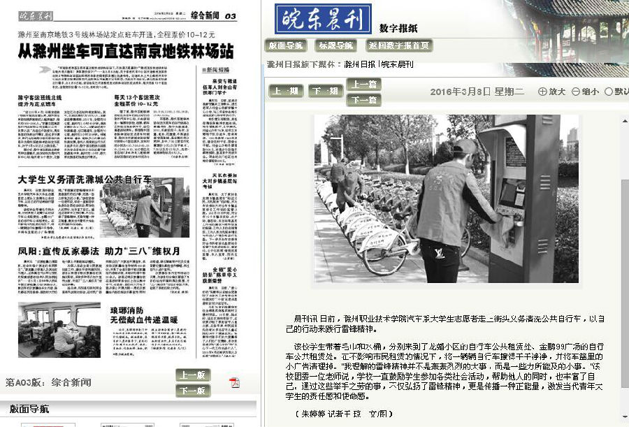 春风和煦,艳阳高照。为了方便市民和同学们的出行,allwincity万象城官方网站汽车工程系15机制(2)班的同学们分别来到了滁州市龙蟠小区的自行车公共租赁处、金鹏999广场的自行车公共租赁处,他们带来了毛巾和水桶,在不影响群众正常租赁的情况下,将自行车一辆一辆的擦干净,并将车篮里的小广告清理掉,方便了市民的出行。通过这次活动,同学们在活动后不仅感到了很充实,同时也认识到了学雷锋,做雷锋,不仅是弘扬了雷锋精神,更是传播正能量,激发当代青年大学生的责任感和使命感。