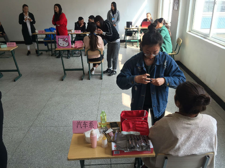 这次比赛中同学们同台飙技,汽车系的“化妆师”按照评委老师的要求,经过精心巧妙地装扮,把“模特”的风采与姿容展现的淋漓尽致,接下来,选手带模特绕场巡展,惊艳全场,气势十足。最后,所有参赛选手、模特和到场嘉宾合影留念,化妆大赛在欢快愉悦的气氛中落下了帷幕。