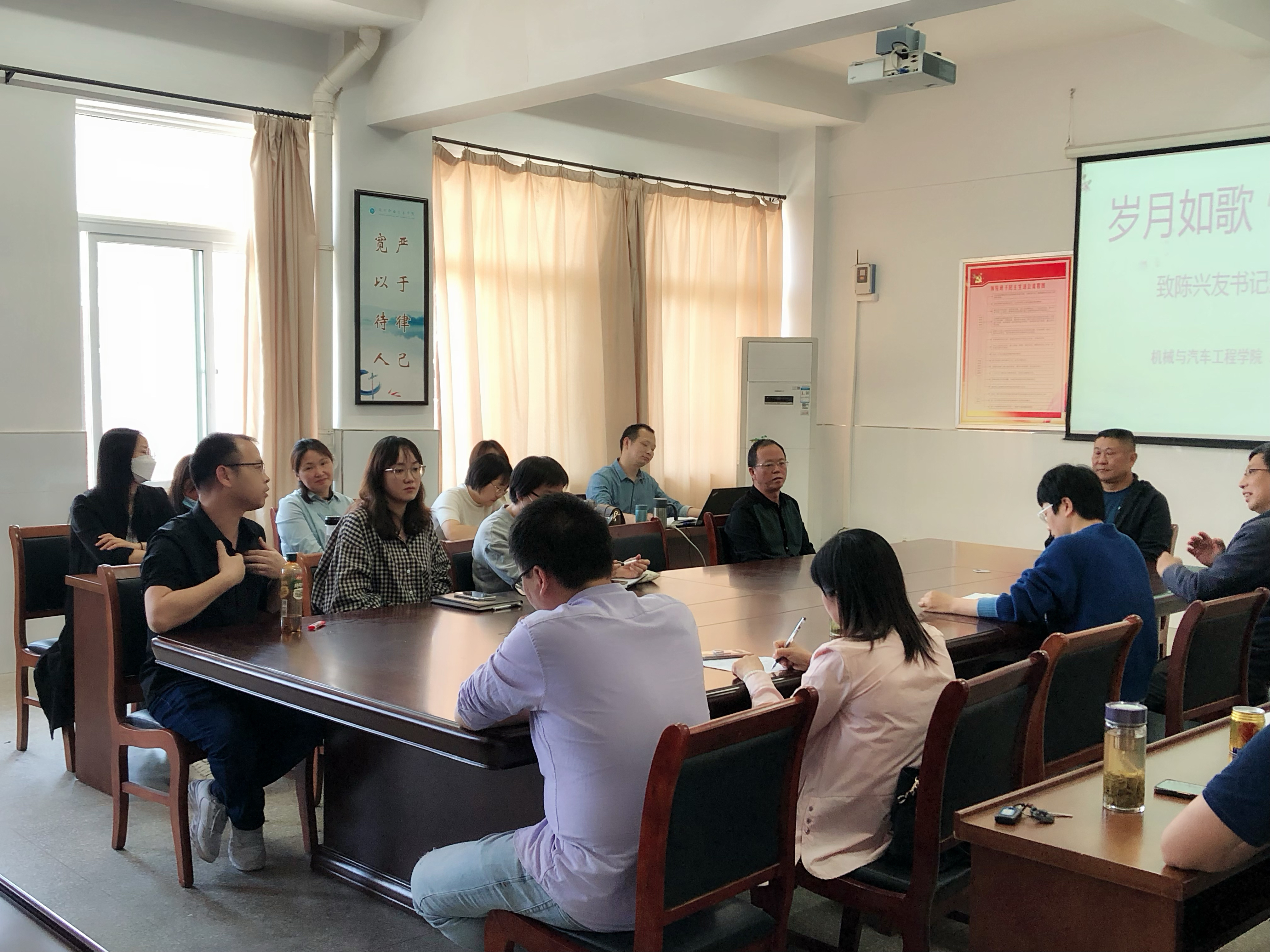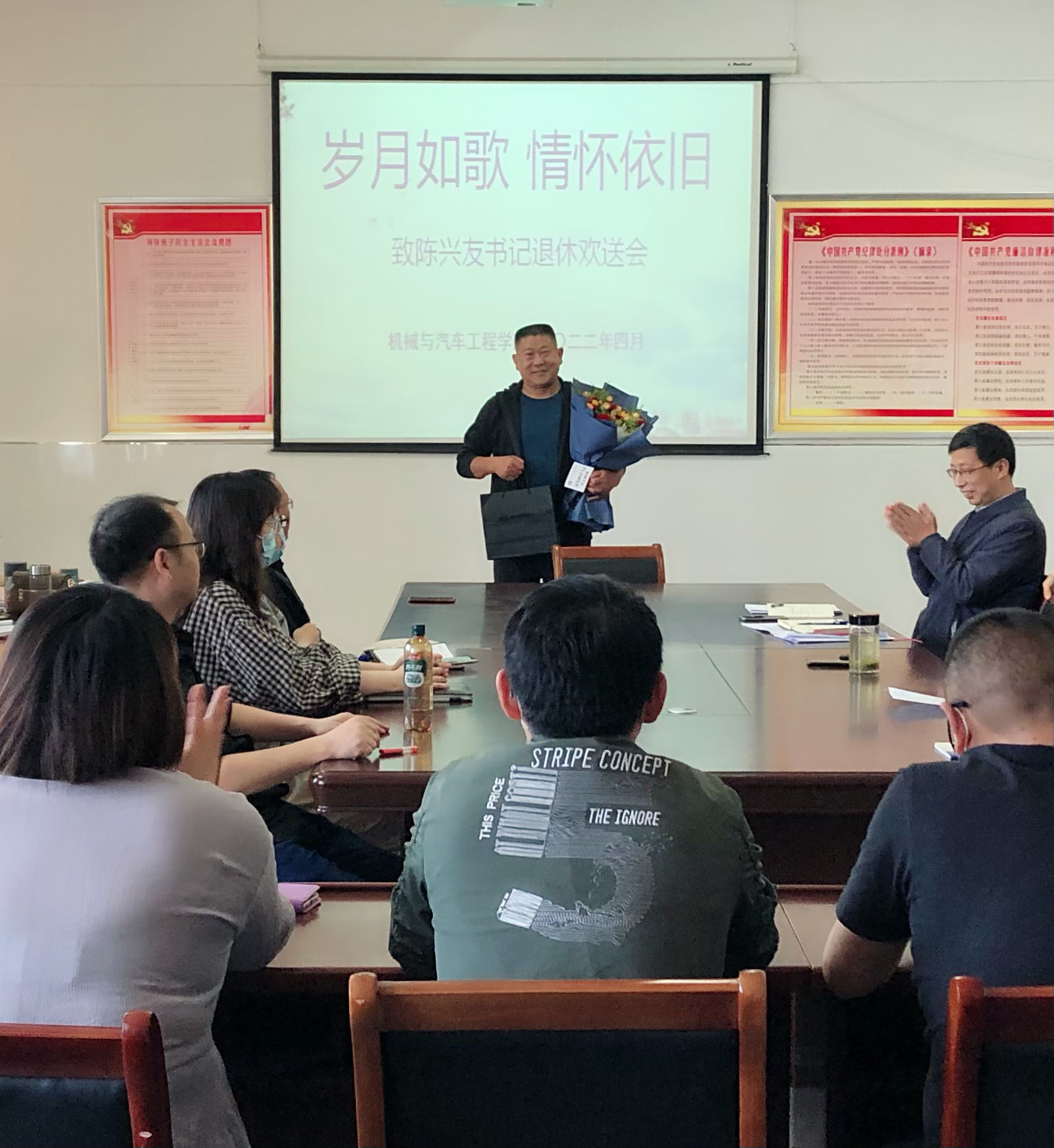 2022年5月4日下午,一场简单却温馨的退休欢送会在5号教学楼5513会议室举行,机械与汽车工程学院全体教师齐聚一堂,欢送陈兴友书记光荣退休。欢送会由机汽学院工会主席王艳主持,吴佳佳代表学院老师向陈兴友送上花束及礼物,张信群代表学院教师发言。