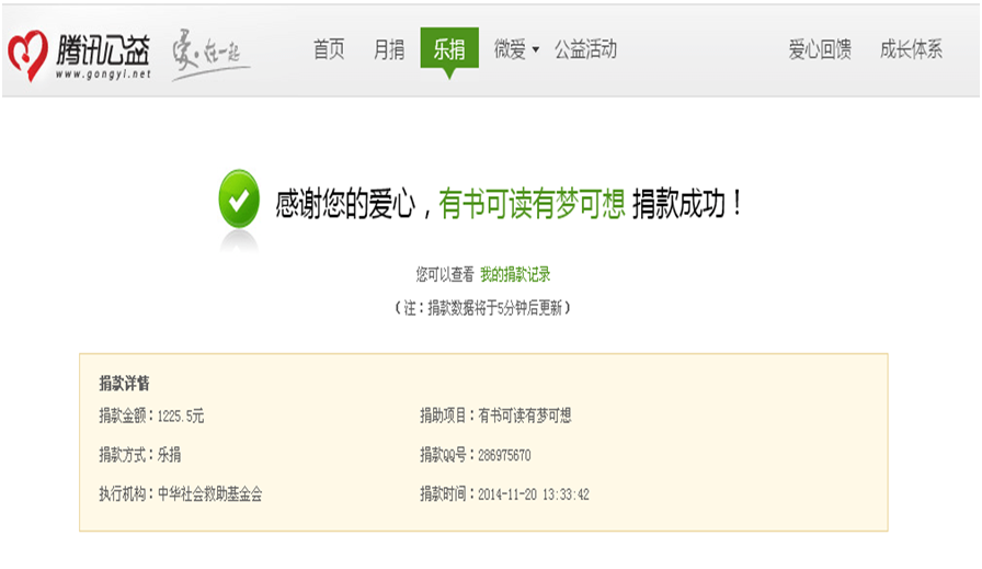 近日,机电系团总支14机电7班团支部为贵州山区的失学儿童进行爱心募捐,全班42名同学,筹集善款1225.5元,通过腾讯公益捐到了中华社会救助基金会,希望同学们的爱心能够让贵州山区的孩子们有书可读,有梦可想。