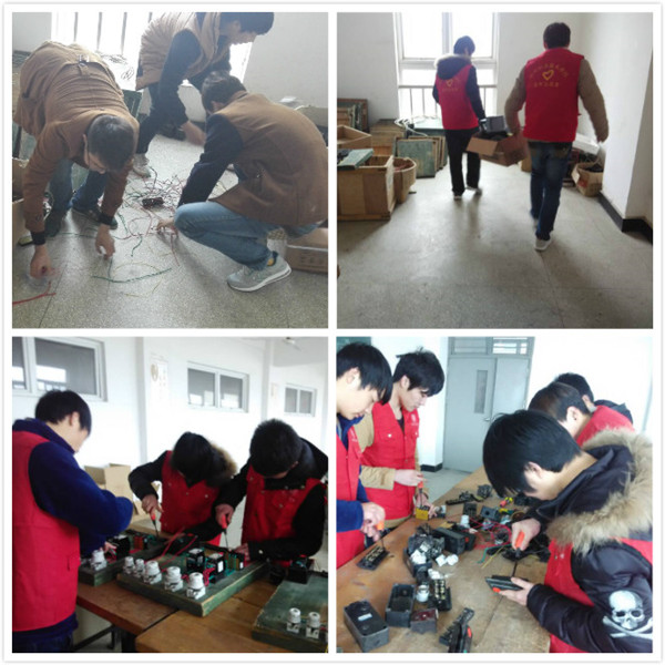首先,同学们先对教室进行整理,摆放好各类机械。并不顾铁片的锋利,线路的复杂。从报废的器械中,用我们的专业知识观察可用的器械,为了能更好的检查,志愿者们用工具把每一个器械都拆卸下来,用心观察每一个器械,确保最大限度的复原好有用的器械,最后经过2个小时的奋斗完成了各类检查,并用好零件组装成好的器械,以备后面的实训用。志愿者们用行动证明了青年志愿者的朴实和奉献。用我们的专业知识来解决问题,彰显新一代大学生的奉献。