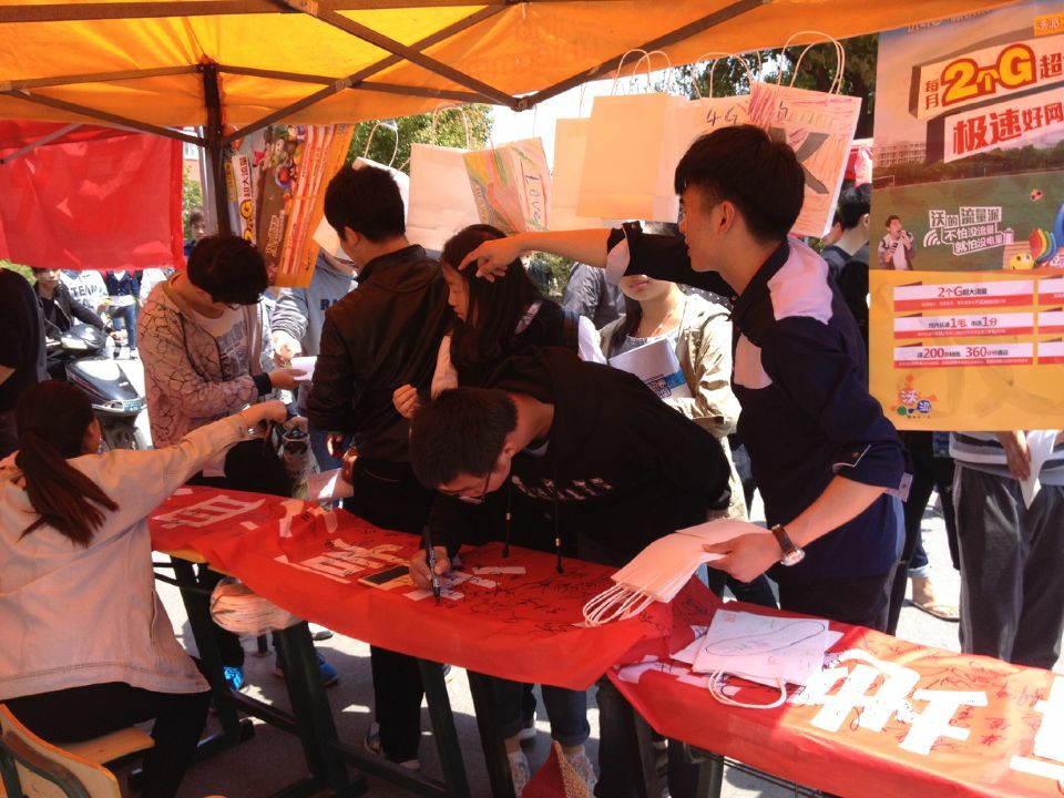 活动中同学们在“同在地球上 共享大自然”的横幅上签下自己的名字,然后领取一个特制的环保纸袋。这样不仅让更多的人了解到这个节日的重要性,还引导他们加入到保护地球环境的队伍当中来。同时呼吁大家善待地球,守护现在,延续未来,促进学生良好的行为习惯的养成,帮助学生树立保护自然、保护生态、保护地球的意识,营造一个大家伸伸手、人人讲环保的绿色教育氛围。活动开始后很快吸引了广大同学们的参与,而“同在地球上 共享大自然的”的条幅上也签满了滁职学子们的名字,事先准备的环保纸袋也被广大同学领取一空。