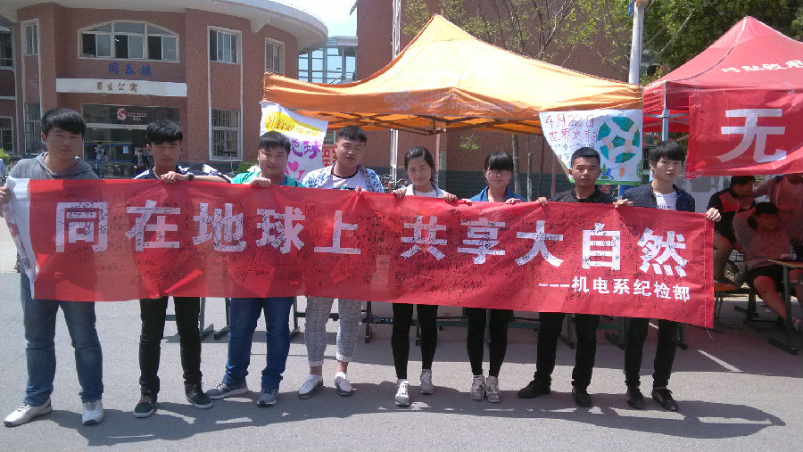 地球是人类共同的家园,保护我们这个赖以生存的地球是每个人的职责。在第46个世界地球日来临之际,机电系学生会纪检部为响应“同在地球上,共享大自然”的主题,使保护环境深入人心。4月22日中午在男生宿舍6号楼门口举行了环保宣传活动。倡导大家保护环境从自身做起,珍惜每一份资源,少用一度电,节约一滴水,将珍惜资源同化为自己的生活习惯。