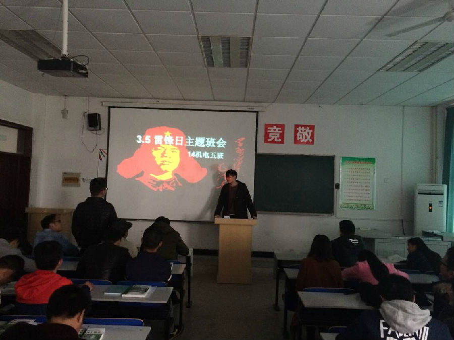 为了准确把握雷锋精神的时代精神,倡导全班同学学习雷锋理想坚定、赤胆忠心的政治热忱,做一个理想远大、信念坚定的人、做一个自强不息、敬业奉献的大学生。2016年3月3日下午一点,机电系14机电(5)班在5103教室召开学雷锋主题班会,团支部委员付天阳主持本次班会。