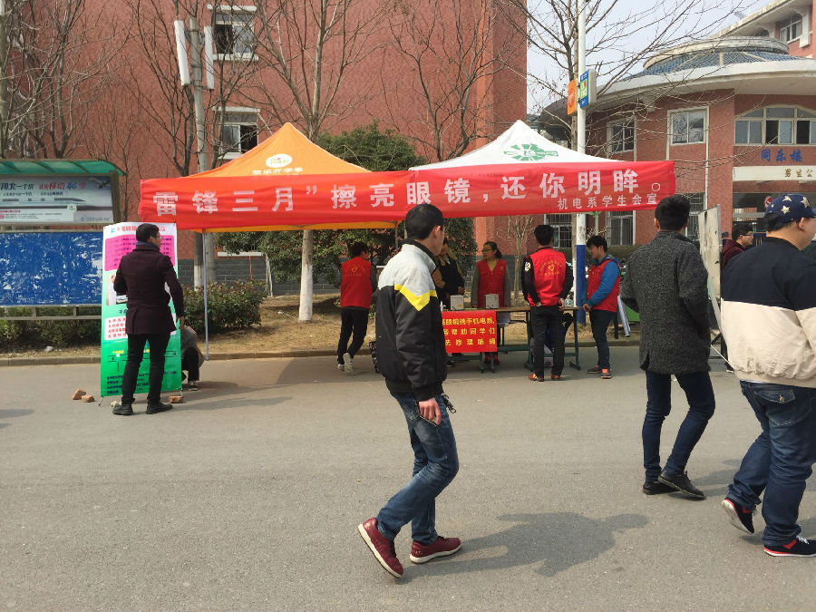 眼睛是心灵的窗户,为呼吁同学们爱护眼镜,提高保护眼镜的意识,进一步发扬学雷锋志愿服务精神,更好的服务广大师生。机电系学生会社会实践部于2016年3月14日中午在女生宿舍一号楼前进行义务清洗眼镜活动。