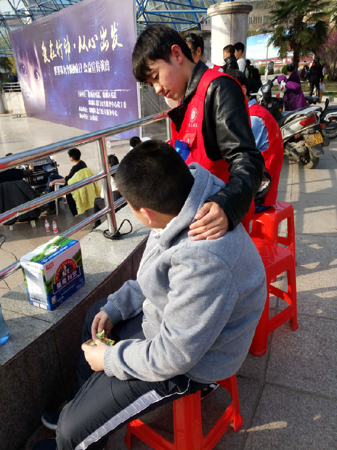 自闭症也称孤独症,主要特征是漠视情感、拒绝交流、语言发育迟滞、行为重复刻板。中国约有120万的自闭症患儿,自闭症在0-6岁儿童致残原因中占据首位,高达78%,男孩自闭症发病占比87.5%,明显高于女孩12.5%。0-6岁是自闭症儿童的最佳干预期,早发现、早干预、早治疗,自闭症儿童的功能会完全恢复。当天下午,我系志愿者们胸前佩戴蓝丝带,号召广大市民关爱“来自星星的孩子”。在现场,他们帮助现场工作人员布置舞台、组织观众等,展现着奉献精神。