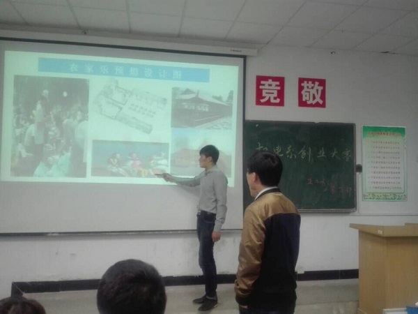 本次大学生创业大赛选手前期经过精心准备,现场通过PPT进行展示自己的创业项目。本次大赛创业的项目有15机电一班健身器材室,15机电二班的启迪有限责任公司,15光伏班的桑基鱼塘生态养殖,15制冷班的品质色彩有限责任公司、白鹭岛六郎阁农家乐饭庄等。通过激烈评比最终15机电二班启迪有限责任公司取得本次大赛的冠军,白鹭岛六郎阁农家乐饭庄获得亚军。