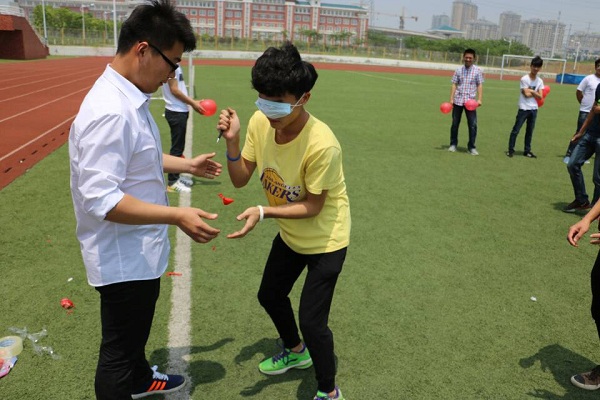 中午小伙伴们来到操场上,按照部门两个人分为一组。一个同学被蒙上双眼原地转十圈,另一个同学指挥他去拿到三米外地上的笔,然后去扎破放在五米的两个气球,用时短的赢的胜利。最终纪检部、安保部、生活部赢的了本次比赛。