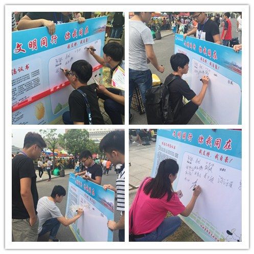 在接待新生的同时,我系团总支学干们让新生阅读了我系提出的校园文明倡议书,来往报道的新生都进行了仔细阅读,表示自己一定可以做到倡议书上的内容,为了表示自己的支持,新生们纷纷在右侧的签名板上留下了自己的姓名。