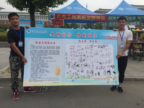 9月10号是个非常特殊的日子,这一天是我院新生报道的第一天,为了让新生了解大学对文明校园的重视,机电系开展了校园文明倡议签字活动,来我系报名的新生都积极的参加了此次活动。