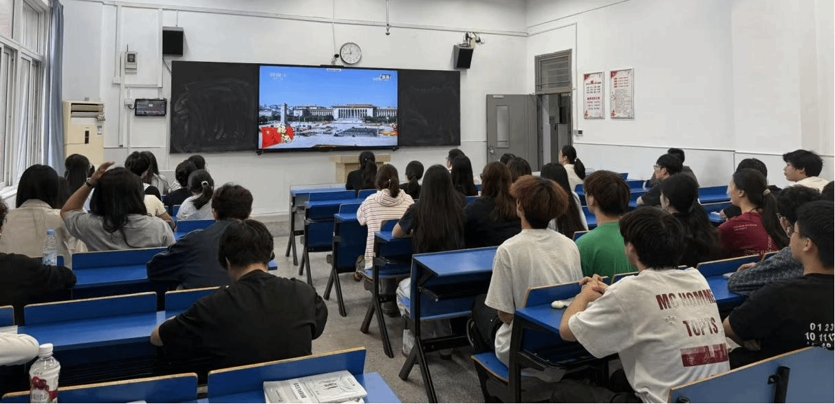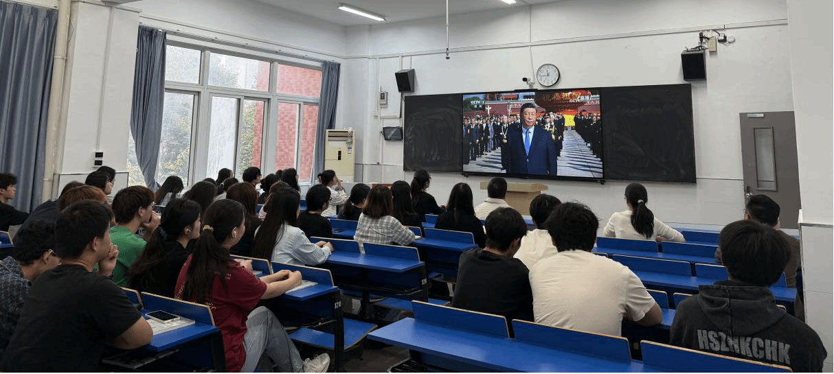 在这个庄严的历史时刻,商学院组织师生代表在致真楼集中收看仪式直播。师生们早早来到教室,怀着崇敬的心情等待这一重要时刻的到来。