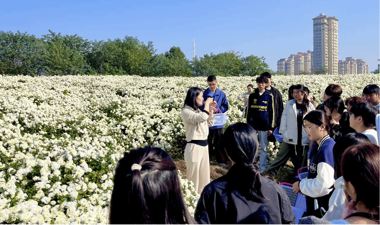 为深入贯彻落实新时代大学生劳动教育的要求,让学生在亲身实践中“受教育、长才干、作贡献”,11月17日,基础教学部劳动教育教研室组织学生走进万象城官网与金玉滁菊公司共建的劳动教育实践基地,开展以“采摘滁菊”为主题的劳动实践课程。该基地旨在打造一个集“种植、养护、采摘、加工”于一体的全景式实践平台,本次采摘环节是继前期参与种植、养护管理后,在“全过程、沉浸式”劳动教育体系中的又一次深度实践。通过这种全链条的课程参与,学生们从课堂走向田野,在理论联系实际中,亲身感知国家级地理标志产品——滁菊的成长历程与制作工艺。