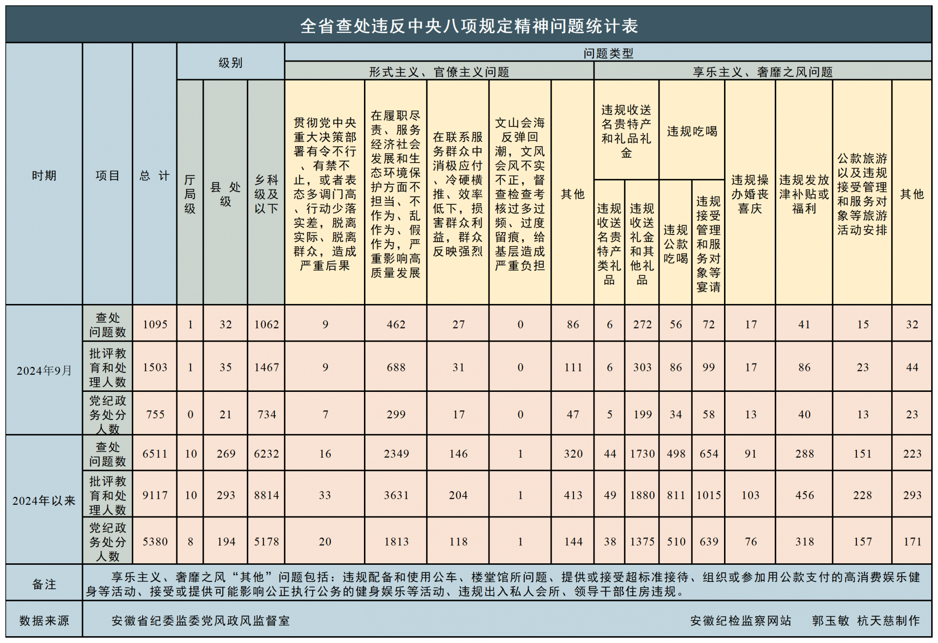 2024年9月全省查处违反中央八项规定精神问题统计指标表