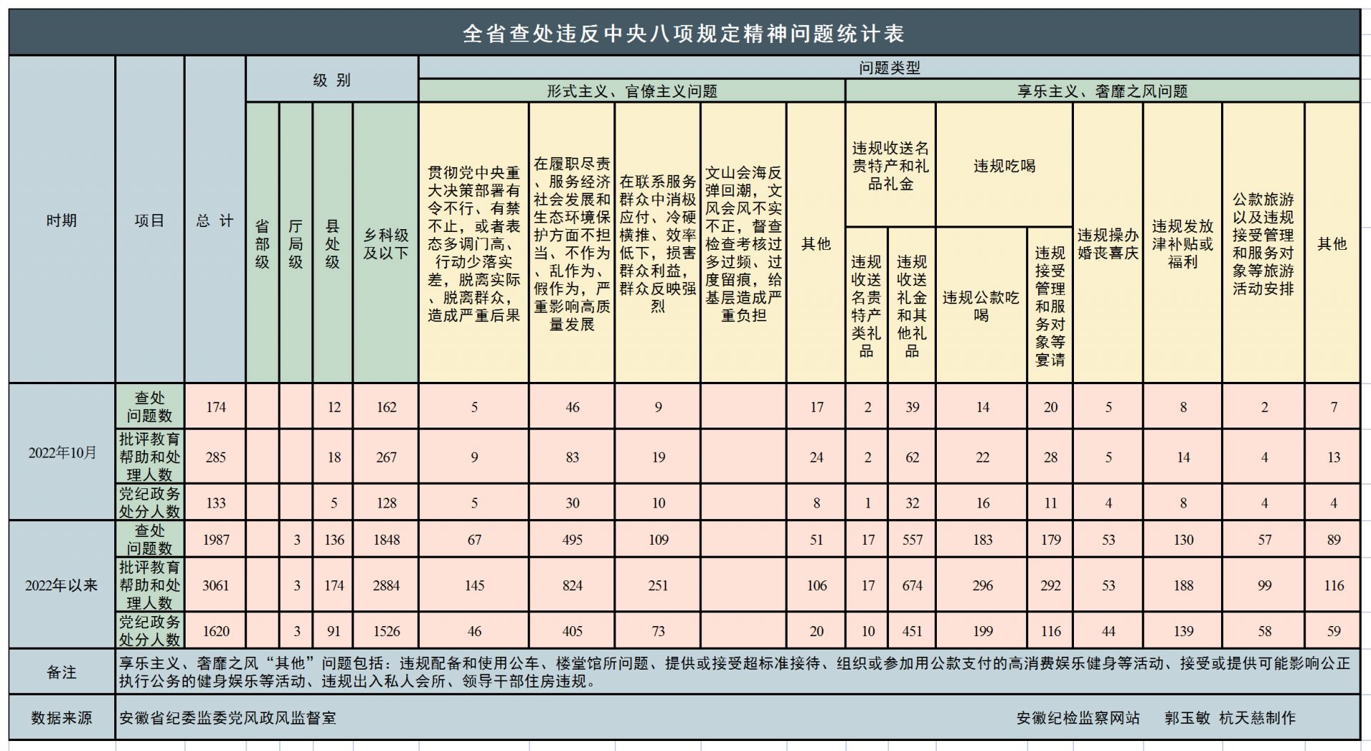 2022年10月,全省纪检监察机关共查处违反中央八项规定精神问题174起,批评教育帮助和处理285人,其中给予党纪政务处分133人,同比分别下降1.7%、上升20.3%、下降3.6%。