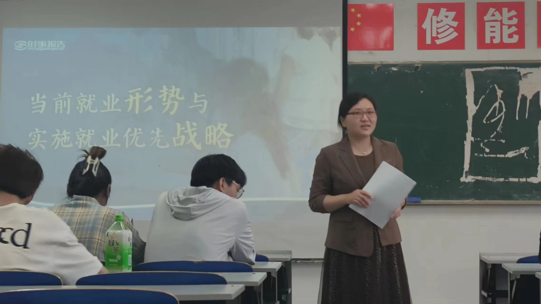 在课堂上,孙静就当前我国稳就业政策、就业形势,我国就业短期风险和长期挑战交织问题,实施就业优先战略的重要举措和着力促进高校毕业生就业四个方面深入浅出的剖析,引导学生正确认识当前就业形势,科学理性看待就业面临的问题和挑战,既正视当前 “就业难”问题,又着眼未来谋划自身职业选择。让学生充分认识到经济长期向好带动就业,优先战略保障就业,帮助他们端正就业心态,增强就业信心。